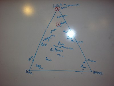 Making such a diagram is fairly simple, but generally goes more smoothly if delegated to two or three enthusiastic and perceptive members of your group. I suppose that you should also make sure that your everyone in your group is okay with having their personality classified. The first picture in this blog post is a ternary personality diagram made by Dartmouth geology students during the Fall 2005 field program. You may notice that I am roughly 55% Iona, 40% Lisa/Jon, and 5% Hannes. Dartmouth students, especially geology students, are pretty chill, so no one in our group seemed to mind their personalities being classified.