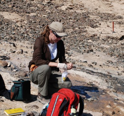 | Collecting a rock sample with Brunton safely stored in its leather carrying pouch (at my waist), Oman, January 2009. |