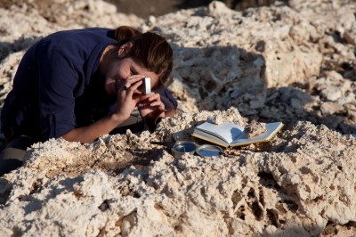 | Using a Brunton inclinometer to measure a far-off mountainslope angle. A regular Brunton rests on the rock to show me the direction I am looking, Oman, January 2009. |