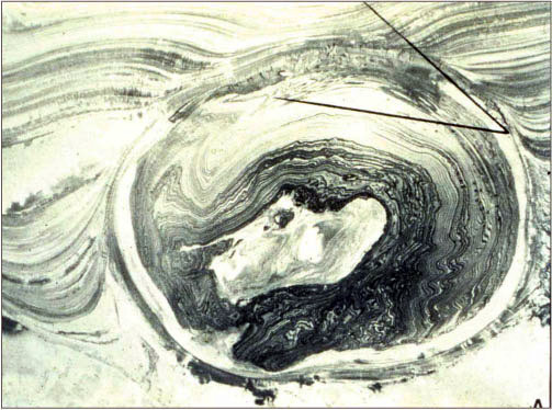 Both surface and subsurface salt deposits are often mined for salt and other evaporite minerals. However, the mining of salt deposits must be done carefully as salt dissolves easily in water, and therefore the presence of water can destabilize salt deposits. Most salt mining is relatively straightforward, but the potential danger was highlighted in a disaster at the Jefferson Salt Mine, which operated underneath Lake Peigneur in Louisiana. As I mentioned above, oil is often found above subsurface salt deposits. On November 20th, 1980, Texaco was drilling into Lake Peigneur to search for oil above the salt deposit. Due to an error, the 14″ drill bit accidentally breached the subsurface salt mine, and water began leaking down into the mine. As the salt deposit and surrounding sediment dissolved and were washed away, the original drill hole was enlarged. An enormous whirlpool developed in the lake as water poured down into the salt mine. When most of the lake water had drained into the hole, a canal that normally drained to the Gulf of Mexico actually reversed direction and continued providing water to the whirlpool for several days.