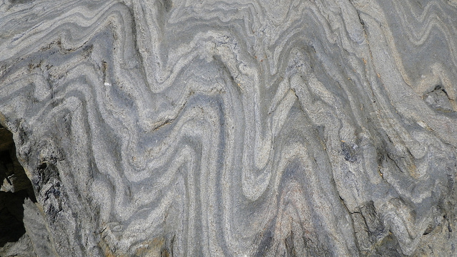 Migmatites actually look very similar to a related rock: gneiss. Gneisses also contain alternating light and dark layers which result under high-pressure and high-temperature conditions. However, in a strict definition gneisses are metamorphic rocks, which means that the light bands form through recrystallization alone; the light layers did not form by cooling from a melt. Distinguishing between gneisses and migmatites can be slightly challenging to do in the field. The two rock types are certainly relatives, so to speak. If a gneiss experiences just slightly higher temperatures, it may partially melt and become a migmatite. Most migmatites probably were gneisses on their way to becoming true hybrid metamorphic-igneous (metagneous? ignamorphic?) rocks.