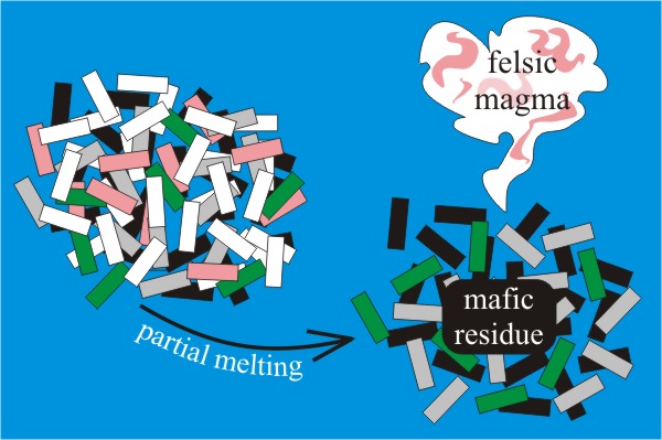 The above figure refers to “felsic” melt and “mafic” residue. Felsic melts are silica-rich and form from silica-rich, generally light-colored mineral such as quartz and k-feldspar. Mafic melts are silica-poor (relative to felsic melts) and form from minerals with lower silicon contents such as olivine, pyroxene, and amphibole. Mafic minerals are generally darker in color, often black, brown, or dark green.