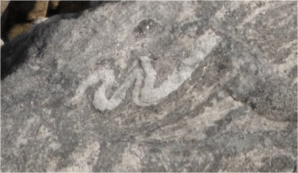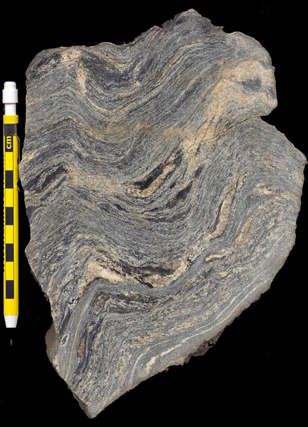 As a quick aside, the word “ptygmatic” was also introduced into the geological literature by Jakob Johannes Sederholm in 1907 and originates from the ancient Greek word for “fold” or “anything folded.” In a way, using the term “ptygmatic fold” is somewhat redundant– like saying “a folded fold.” However, the term “ptygmatic” in the geologic literature generally refers to tight folds that form when the folded material has a greater viscosity (resistance to flow) than the surrounding medium. In migmatites, ptygmatic folds often form in the more-viscous lighter layers.
