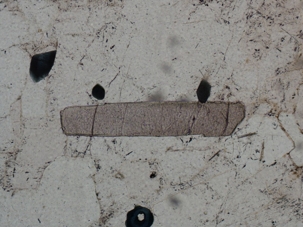 In the hornblende pictures above, the large crystal of hornblende is actually a composite crystal of hornblende which formed at slightly different orientations. One section of the large horblende crystal is brown at the same time that another section has turned dark gray. This “composite pleochroism” is commonly observed in thin section and can sometimes provide useful information about crystal structure and growth.