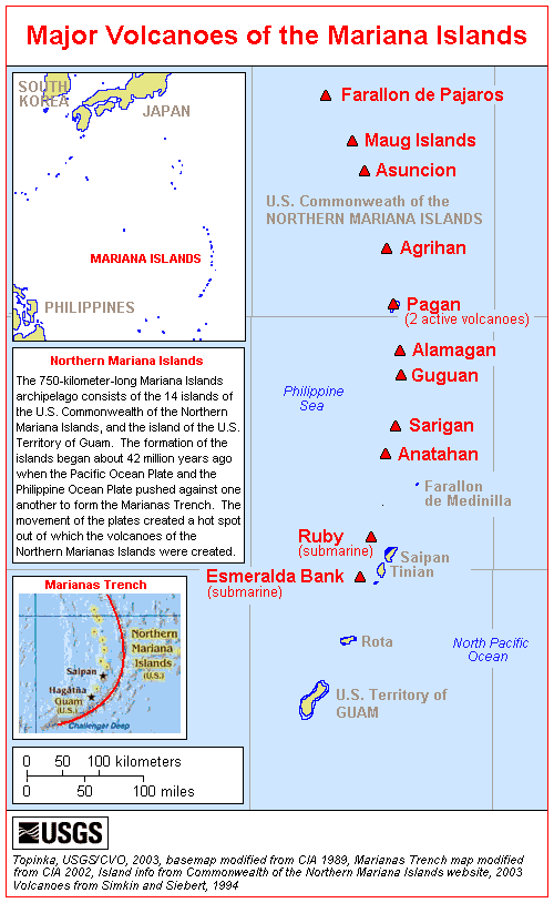 Guam was built from volcanic eruptions starting around 43 million years ago. The most recent volcanic eruption on Guam was around 10 million years ago. Therefore, geologists do not anticipate that there is currently a high risk of a volcanic eruption on Guam. However, there are plenty of active volcanic islands located near Guam, as is shown in the USGS map below.
