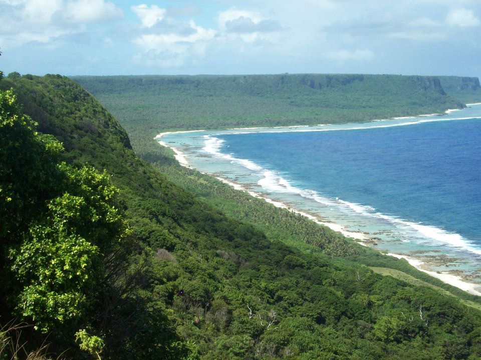 Because Guam hasn’t been volcanically active in about 10 million years, there has been time for carbonates (limestones) to form on top of some of the volcanics, and there are abundant coral reefs located offshore. One place where some impressive carbonate deposits have formed on Guam is Tarague Embayment, which is shown in this week’s geology picture. The rocks are a little hard to see since they’re covered under thick green vegetation. Underneath that vegetation, though, there is a limestone cliff that was formed in the Pliocene-Pleistocene (within the last 5 million years or so).