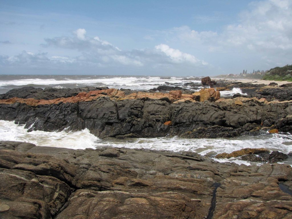 This week’s geology picture is a light-colored dyke amongst some darker rocks on the beach in the little town of Munster, South Africa. You can also see some metal in the background– that’s all that remains of the Nightingale, a fishing trawler which ran aground on the beach in 1933. Most of the metal is the ship’s boiler.