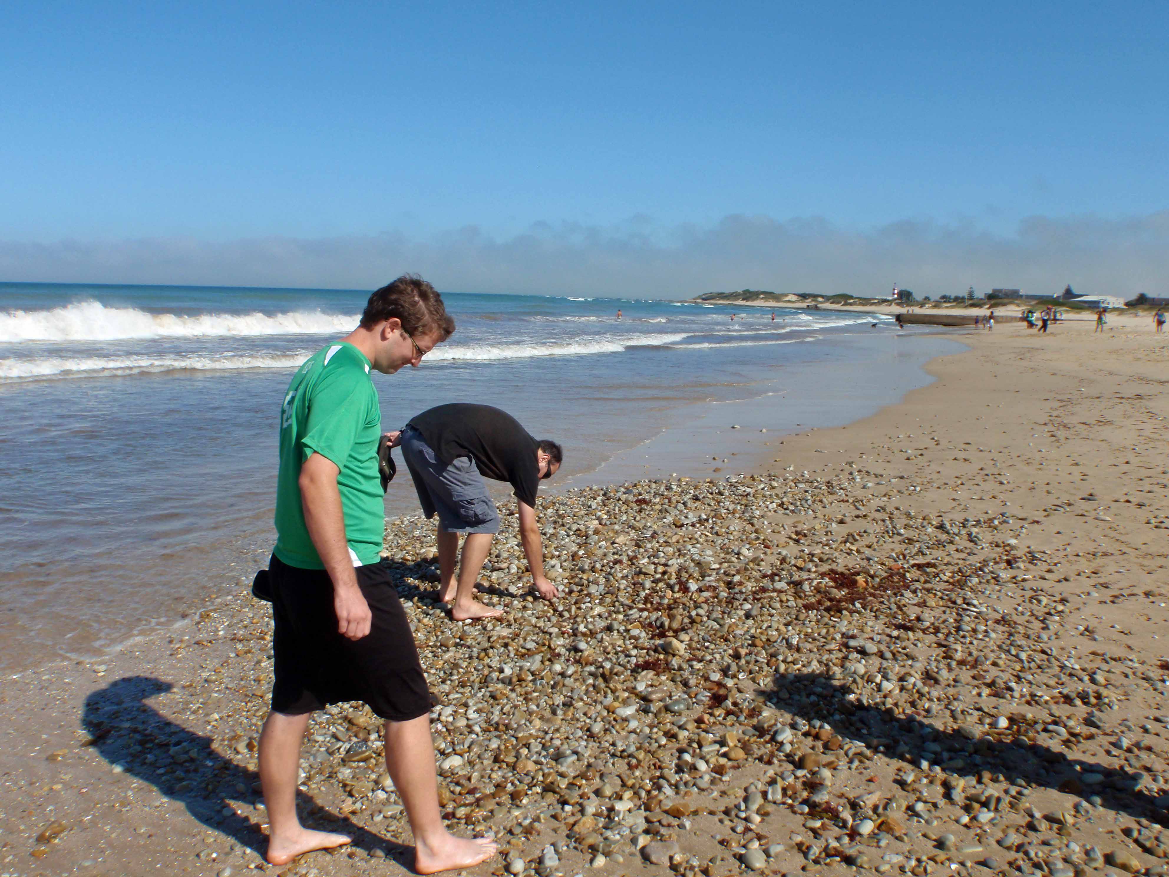 For this week’s Monday Geology Picture post, I thought I would share some pictures which I took last month on a beach in Port Elizabeth, South Africa. As I was walking along the beach with my husband and some friends, we came across a pile of rounded pebbles of various lithologies. Some of the rounded pebbles seem to be anthropogenic in origin– I think they are rounded pieces of brick.