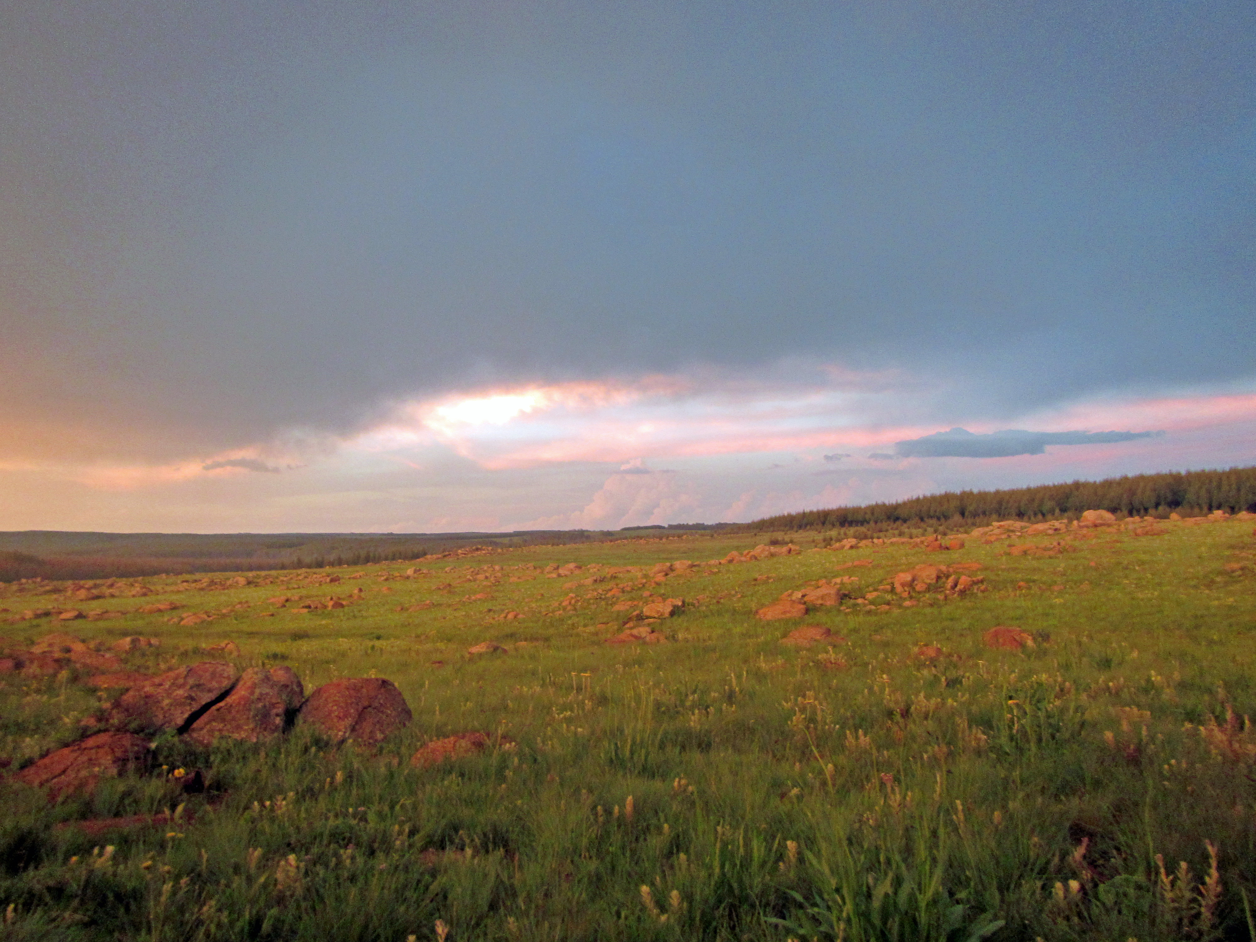 For this week’s “Monday Geology Picture” post I thought I’d share a picture from my trip to Dullstroom in Mpumalanga, South Africa, a few weeks ago. I took this picture as we were driving late one evening, just before sunset. I didn’t take a close look at the rounded boulders dotting the field, but they are probably granitoids or possibly dolerites. Although don’t take my word on that– it’s difficult to identify rocks when driving by them rather quickly!