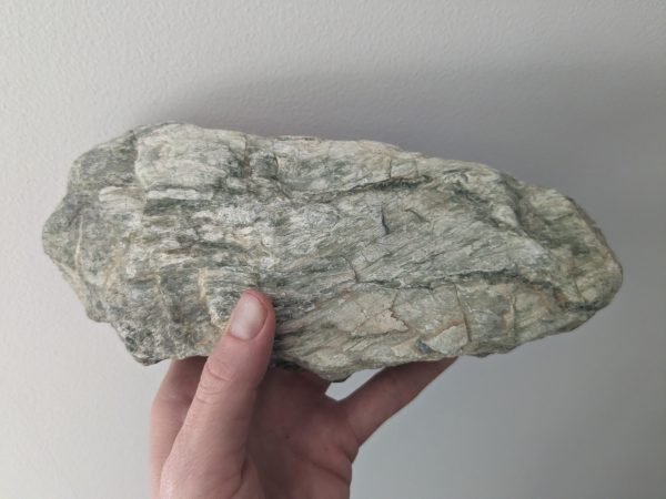 The photograph below shows anther example of luster. This rock contains serpentine and talc. The white talc has a pearly or perhaps waxy luster. The green serpentine has a silky luster.