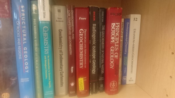 As a geologist, I have quite a few reference books, including some textbooks that I consult fairly regularly. Today I’m sharing a picture showing a portion of my reference bookshelf in my office. You can see here that I have quite a few geochemistry books — actually, these are just some of the ones I have. What does your geologic reference bookshelf look like? Feel free to share a picture.