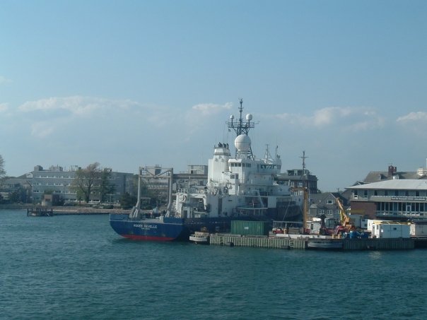 I spent two months (early June – early August) aboard the R/V Roger Revelle during an expedition to the Ninetyeast Ridge in the Indian Ocean. Although the R/V Revelle is a Scripps Institution of Oceanography research vessel, during the summer of 2008 the ship spent some time in Woods Hole, MA on the dock owned by the Woods Hole Oceanographic Institution. I was very happy to see the ship and the crew again– many of the crew members were the same ones who were aboard during the Ninetyeast Ridge expedition. My boyfriend (now my husband; we met aboard the Revelle during the Ninetyeast Ridge expedition) and I threw the R/V Revelle a 4th of July party at my house in Woods Hole. The R/V Revelle staff kindly provided much of the food and drink since it was a little difficult for us to feed a hungry crew by ourselves. Oceanographic research vessels travel all over the world and spend time in many ports, so you never know when you might see them again!