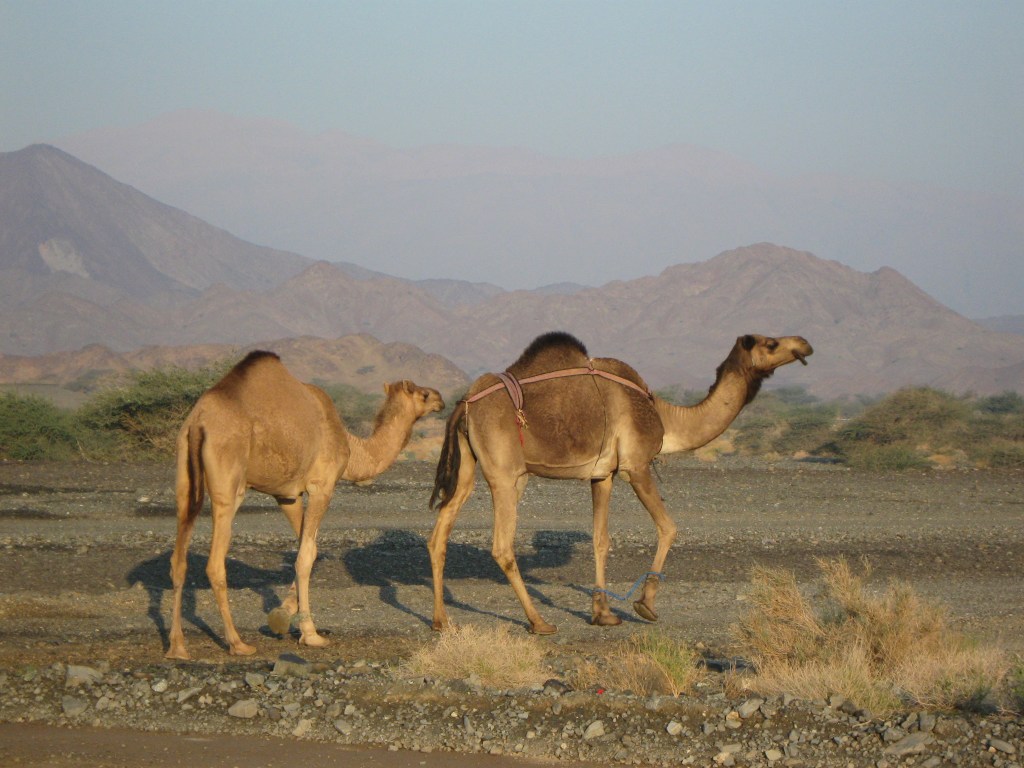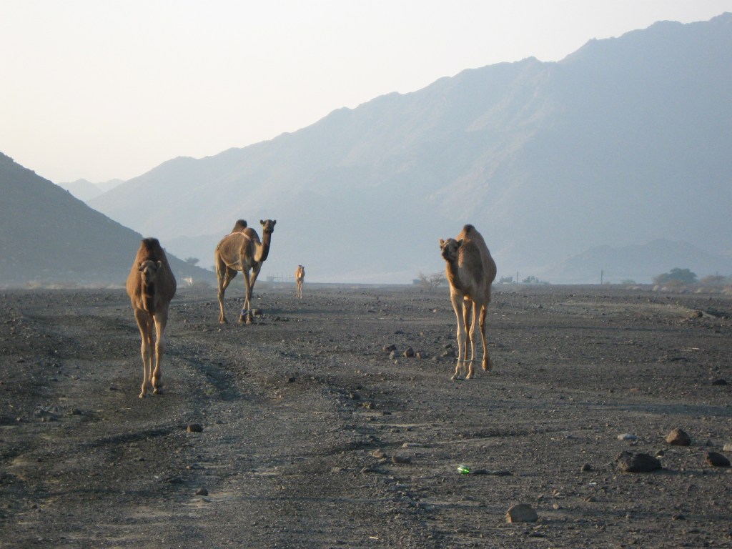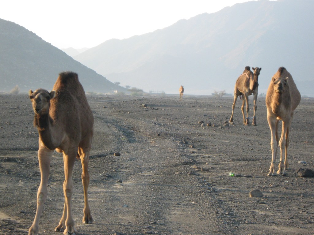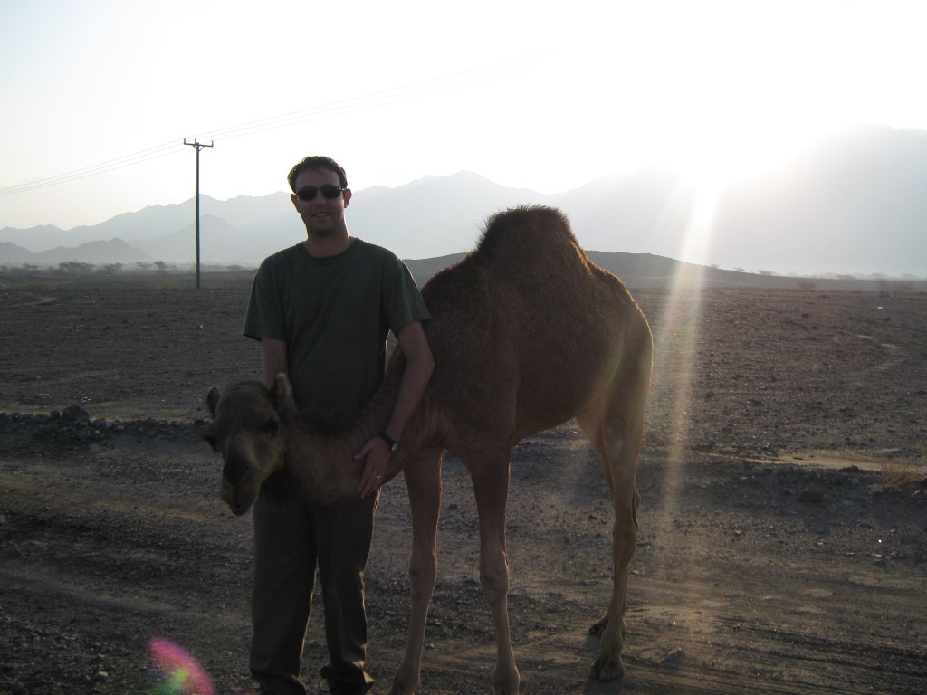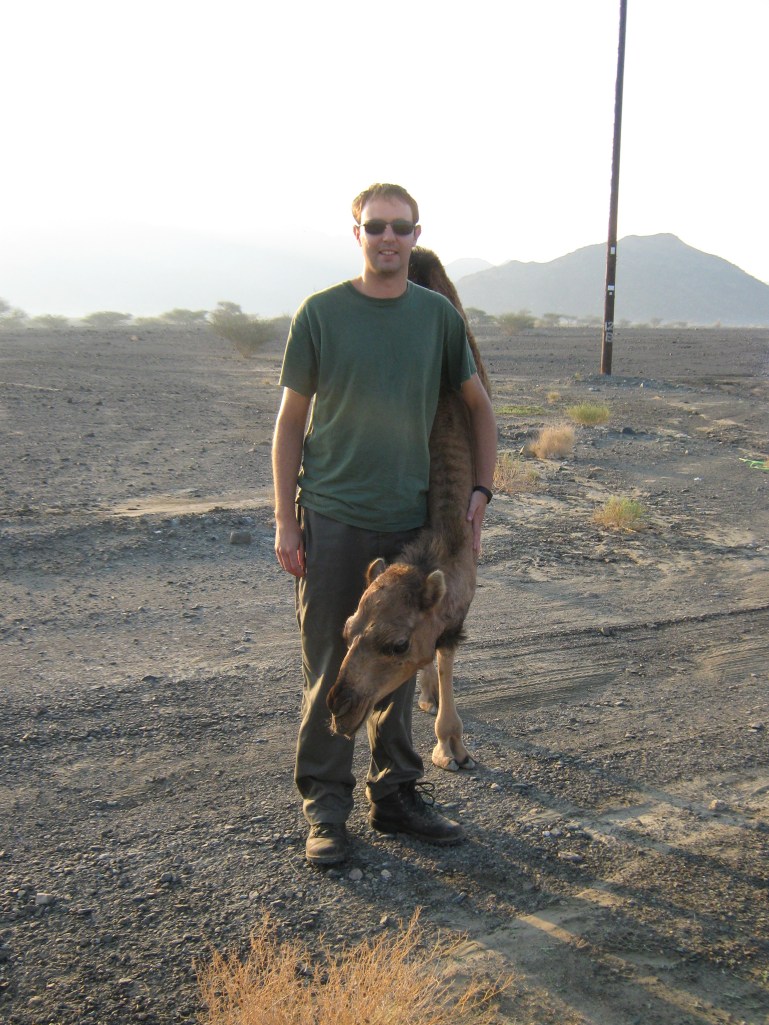 However, there were also plenty of wonderful field moments during the 2010 field season to make up for the challenging times. I wanted to share one moment in particular: a camel sunrise. As Jackie and I were driving out of camp early one morning along a dirt road, we stopped to observe four camels in the distance. As we stood by our Land Cruiser, the four camels slowly walked towards us and came over to say hello. We pet all of the camels, and a juvenile camel was particularly affectionate. After awhile, the camels continued on their way, stopping now and then to nibble on Acacia trees as they shuffled along. I have a vivid memory of the few minutes we spent watching the camels– the early morning light was beautiful, and for that moment all the world seemed to contain were the two of us, our Land Cruiser, the camels, and the mountains. In a busy, often crowded world, I’ve learned to treasure such moments. It was one of those moments that makes you remember why you became a geologist. It was one of those moments that makes you remember why you keep going into the field– floods, goats, camel spiders, “death flu”, and all.