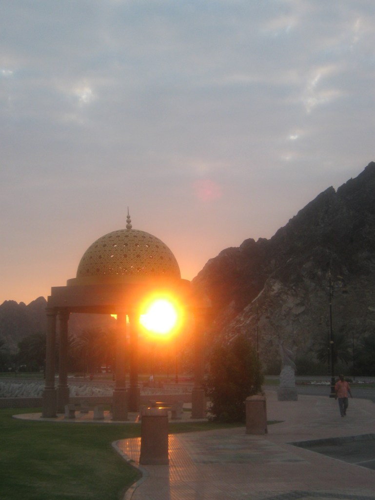 Sunrise over peridotite mountains in downtown Muscat, the capital of Oman.