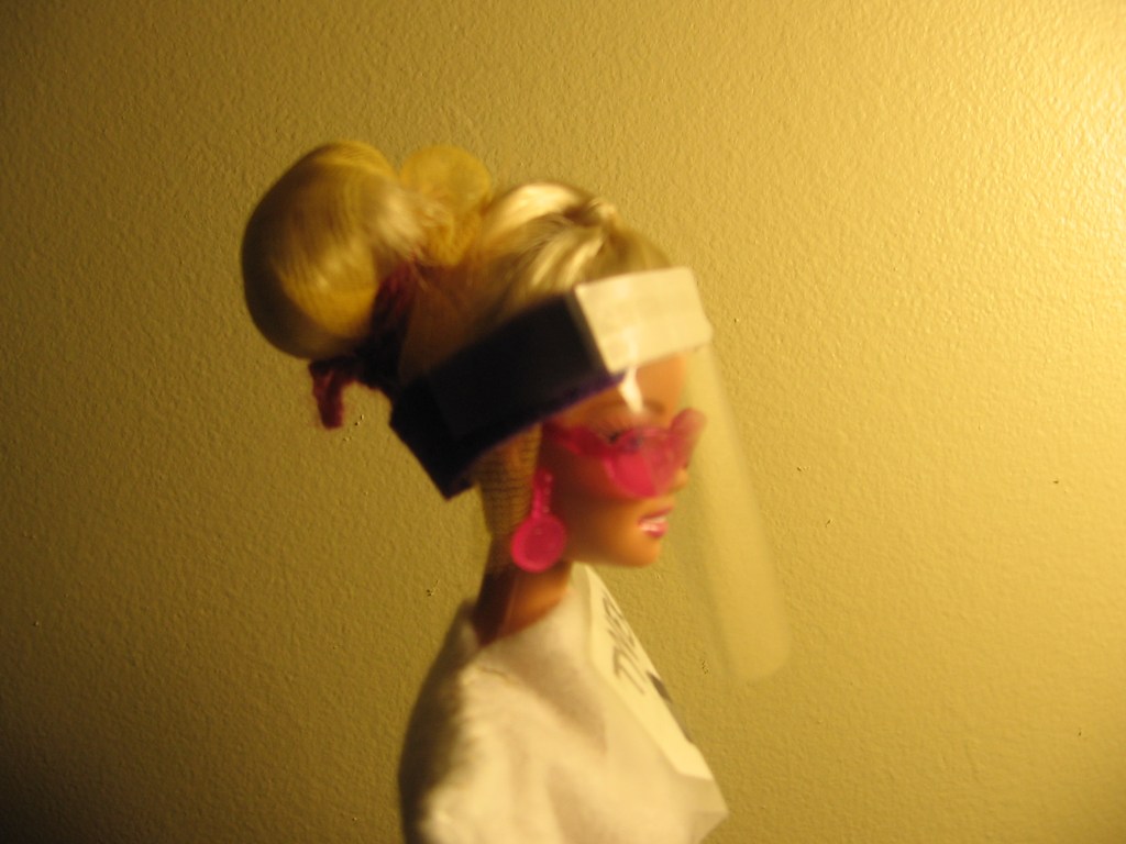 A closer look at Geochemist Barbie's hair net, safety goggles, and face shield. Geochemist Barbie thinks chemistry is fun!
