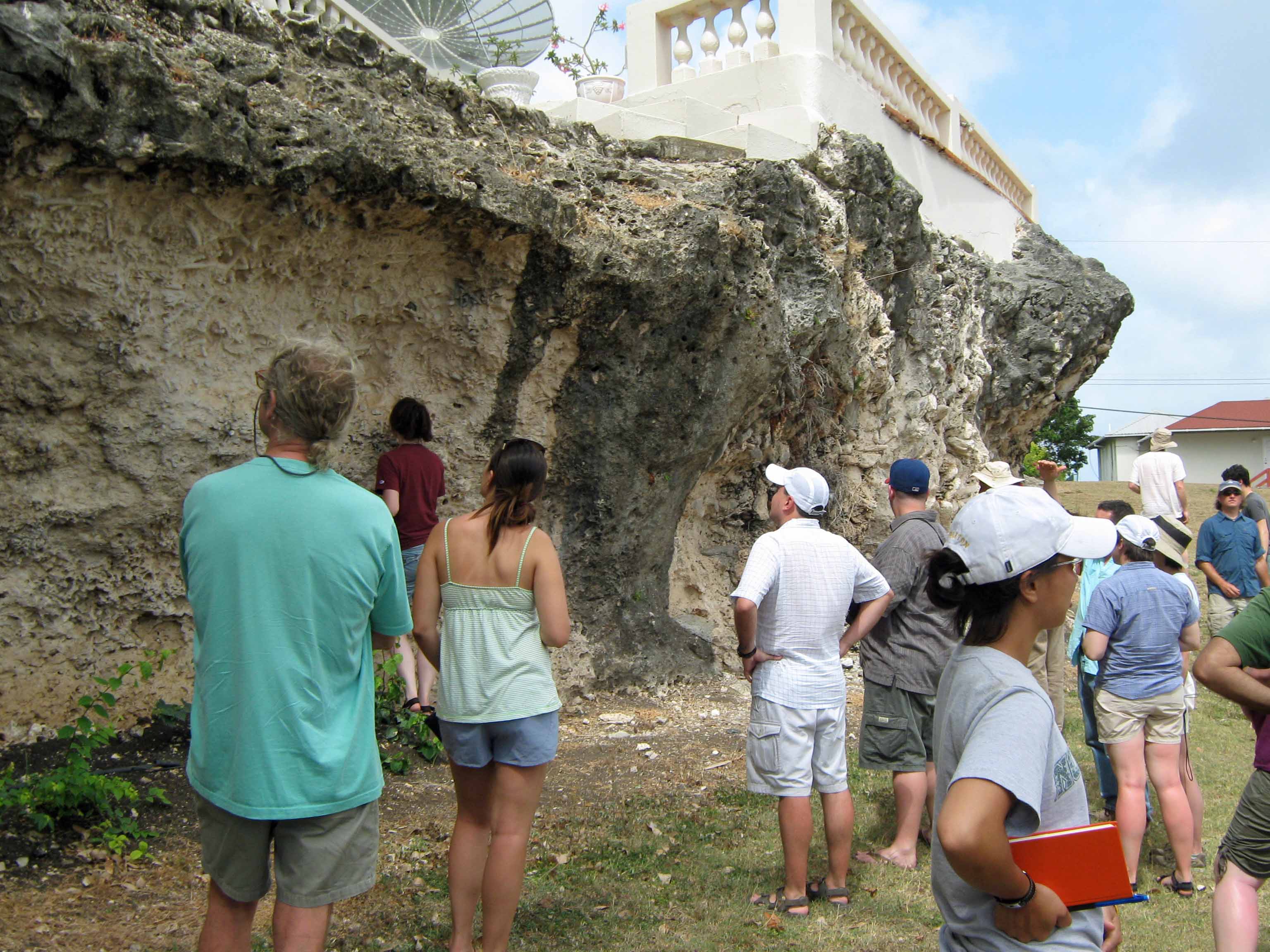 Another view of the backyard coral outcrop, Barbados, June 2009.A group of geologists gathered around the backyard coral outcrop, Barbados, June 2009.A student taking a closer look at the backyard coral outcrop, Barbados, June 2009.
