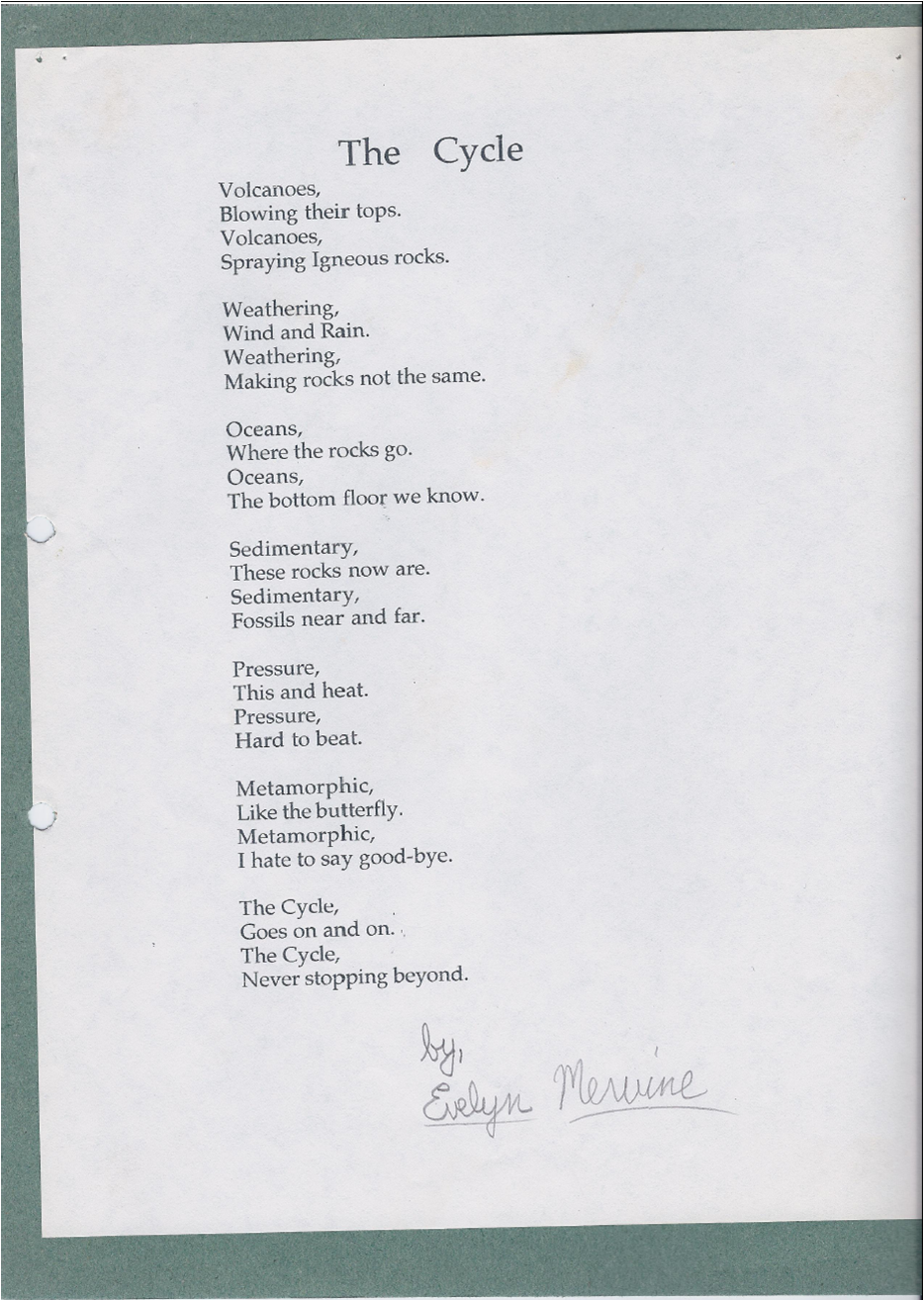 Rock Cycle poem, mounted on stylish (but faded) construction paper. Click to view larger.