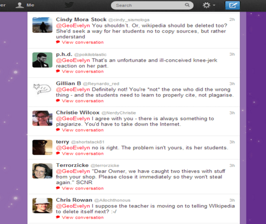 Overwhelmingly, my twitter followers agreed that I should not take down the blog post and that requesting that primary sources be taken down from the internet is an inappropriate way to handle plagiarism. Here is a sample of the many, many replies I received on twitter: