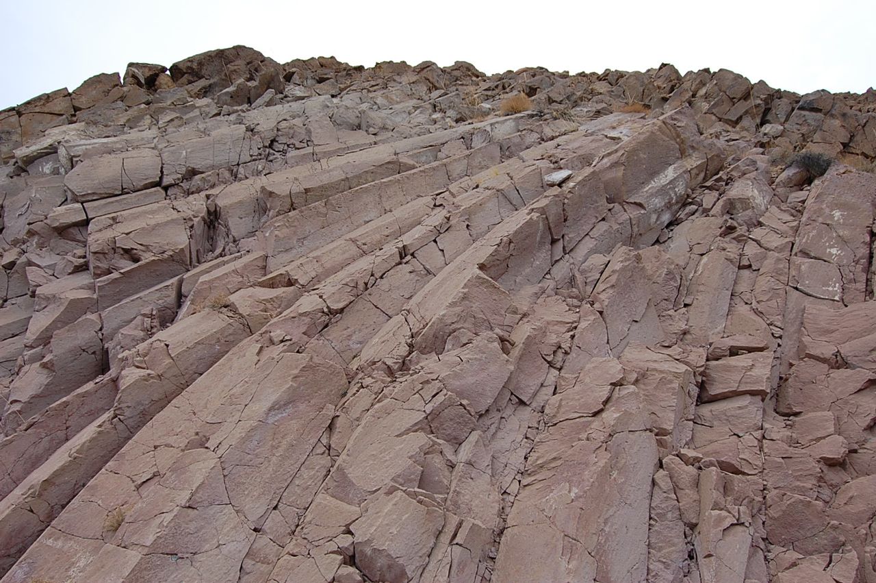 Columnar jointing isn’t restricted to basalts, however. This structure can also form in other types of rocks which undergo cooling and contraction. For example, here is some columnar jointing in the Bishop Tuff of the Long Valley Caldera in California: