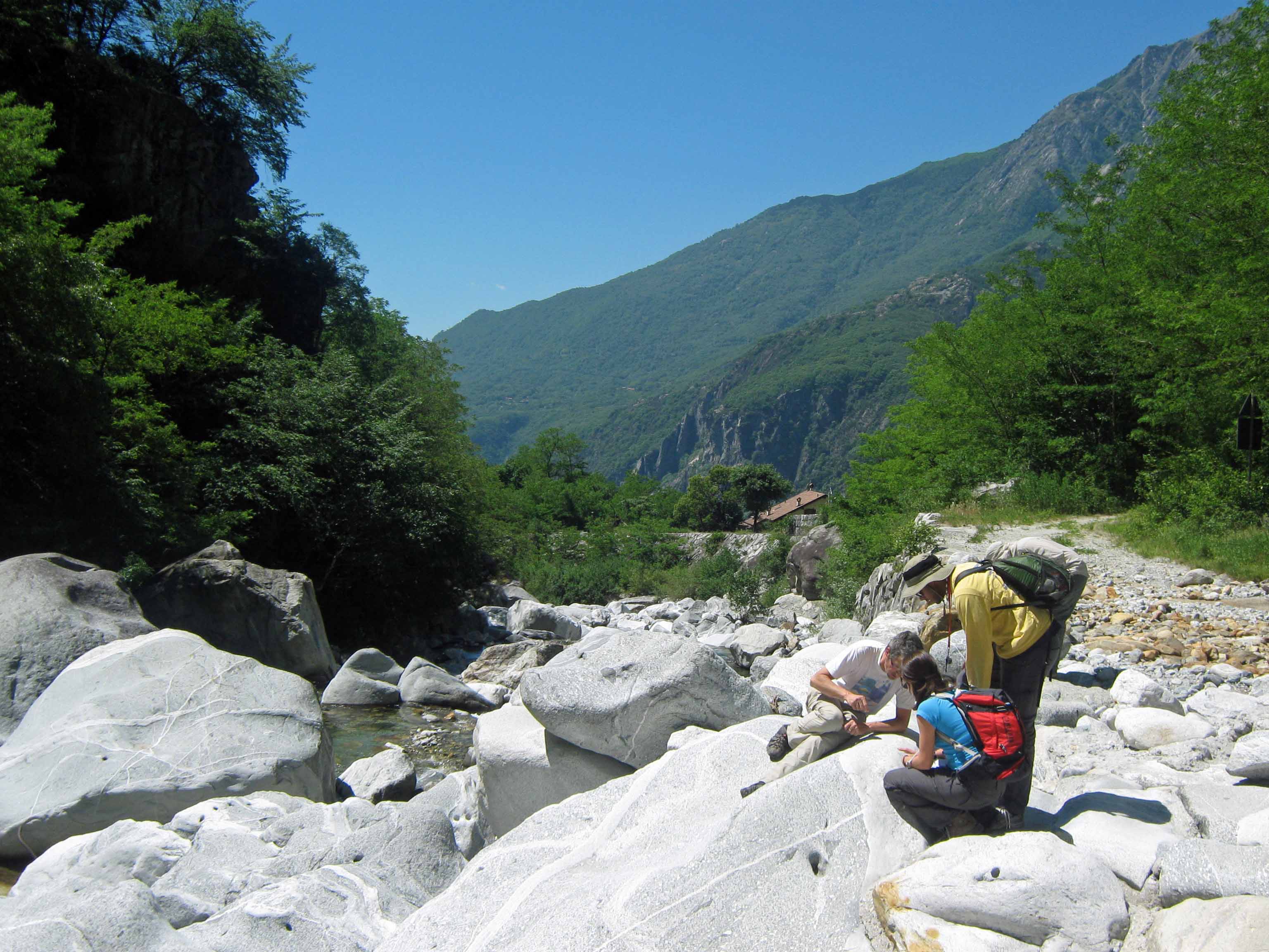Three geologists taking a close look a boulder with their hand lenses.A geologist taking a good look through a hand lens.A geologist preparing to take a good look at a mineral grain through a hand lens.
