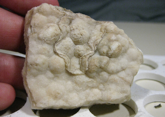 When geologists encounter pieces of rock that are not found in situ at an outcrop, they refer to these rocks as “floats.” Floats are pieces of rock that have been removed and transported from their original outcrop. Sometimes, float rocks are found very close to outcrops. For example, weathering and erosion may create a pile of float rocks at the bottom of a hill below an outcrop. Often, geologists will first notice float rocks and then will look around– and often find– the outcrop from which the float rocks originated. Of course, geologists can never be 100% sure that a float rock originated from a particular outcrop, but they can be pretty certain if there is a similar rock in outcrop nearby the float. Other times, float rocks are found very far from their original outcrops. Water, ice, and even wind can transport rocks very far from their original outcrops. A well-known type of float rock is a glacial erratic, a rock which has been scraped up and transported by a glacier.