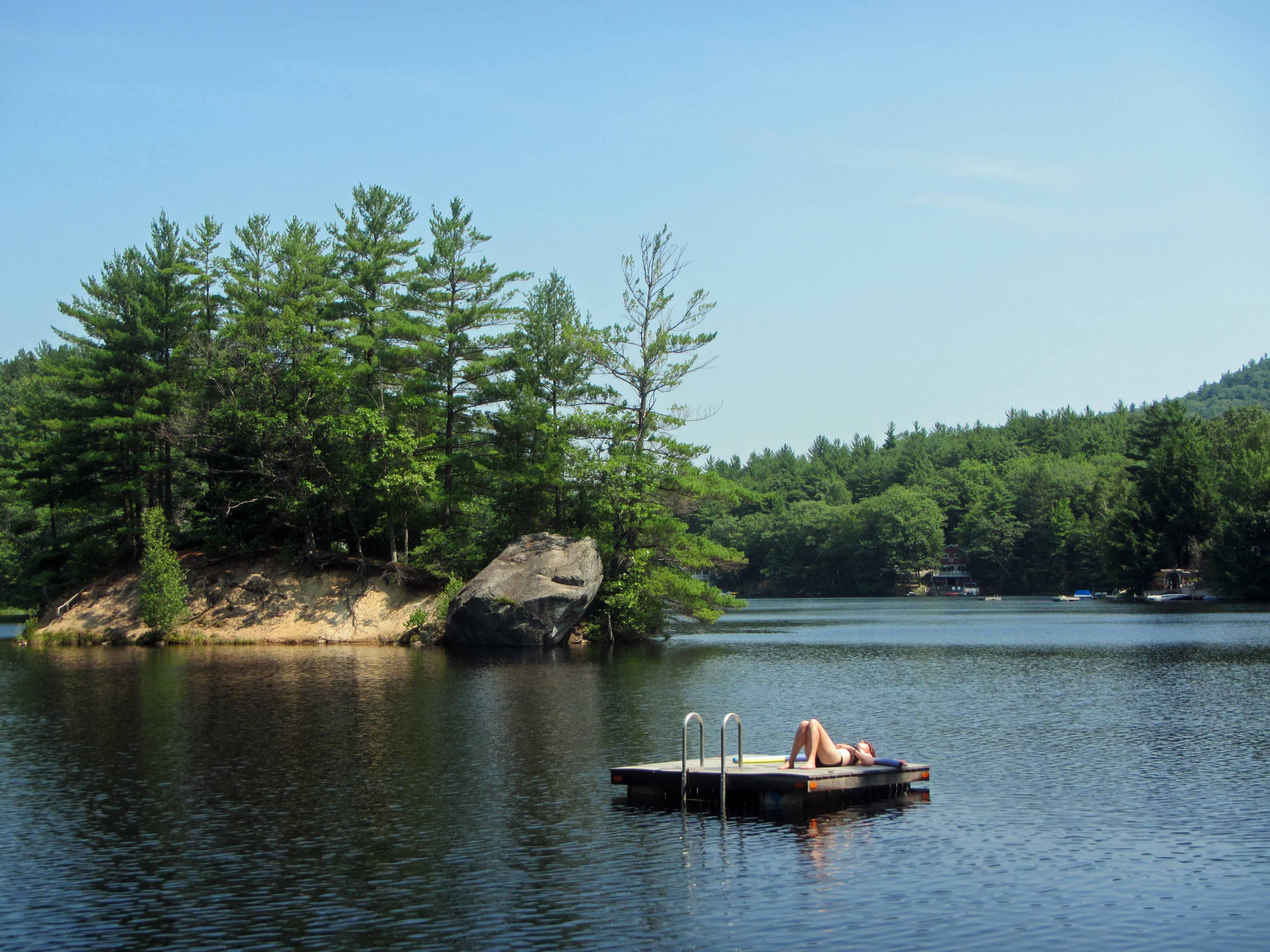 Sunbathing by my favorite glacial erratic. Franklin Pierce Lake, June 2013. Photograph by Jackie Gauntlett.