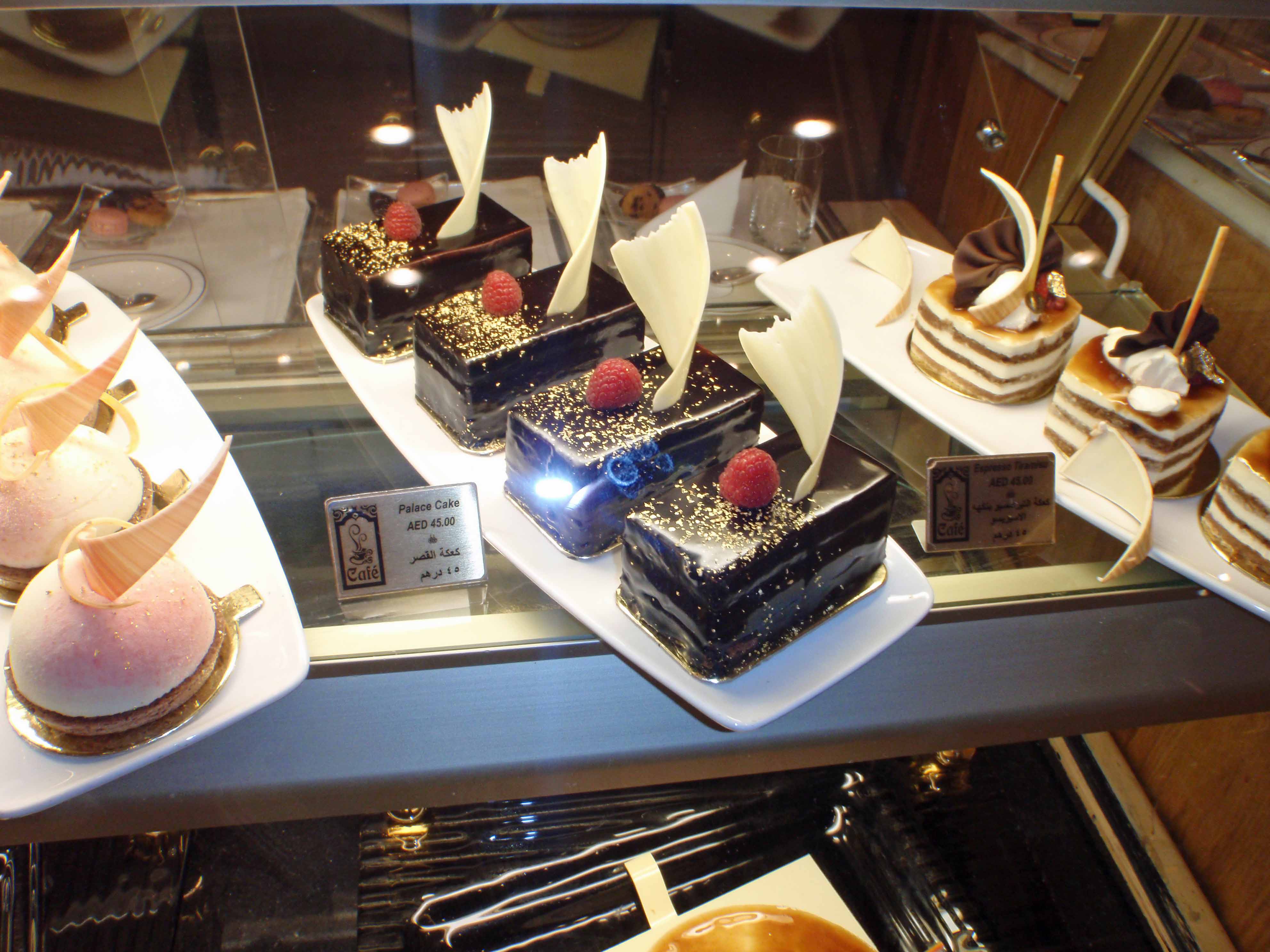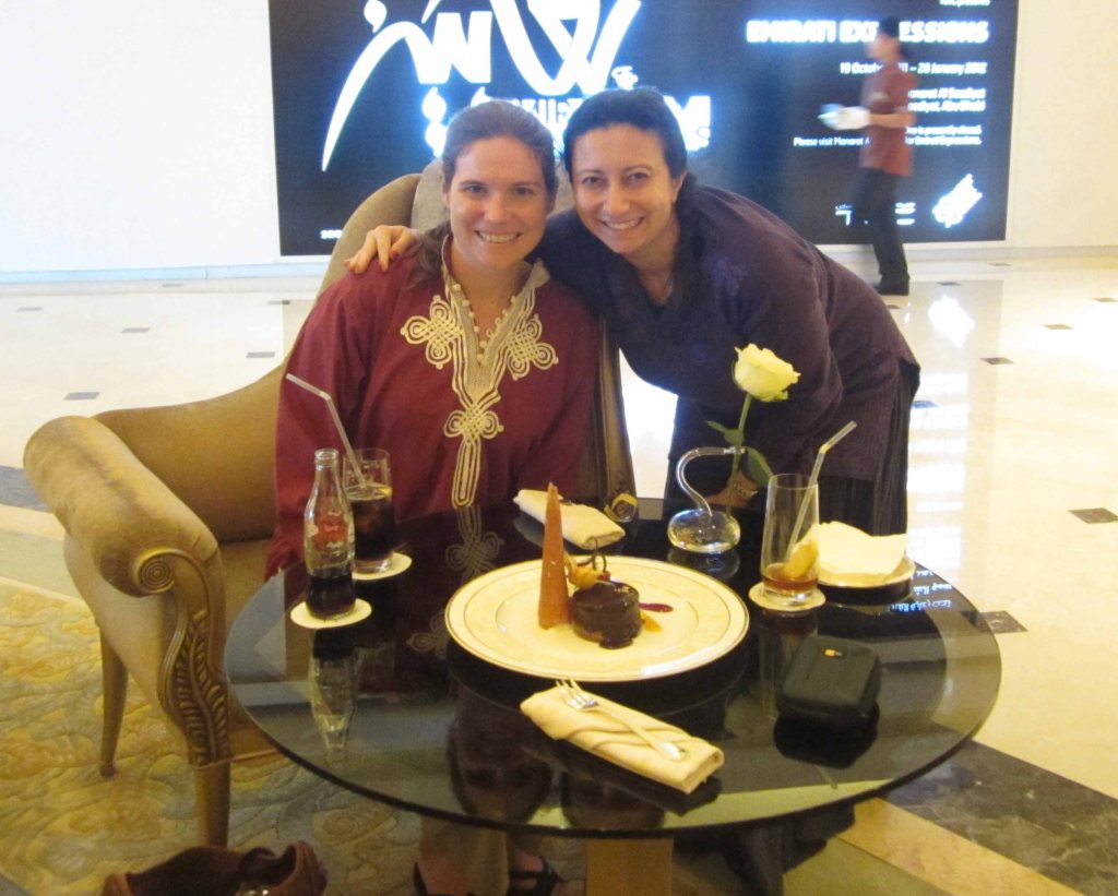 Karima and I didn’t stay at the hotel– we couldn’t afford it, most likely! Rather, we went for a fancy lunch, which was fairly expensive but a fun treat for a girls’ day out. We started with a mixture of savory snacks: Western style tea sandwiches and Middle Eastern style pita bread, hummus, and falafel. Then, we ordered a chocolate treat to share. To our delight and amazement, the chocolate treat was sprinkled with gold leaf.