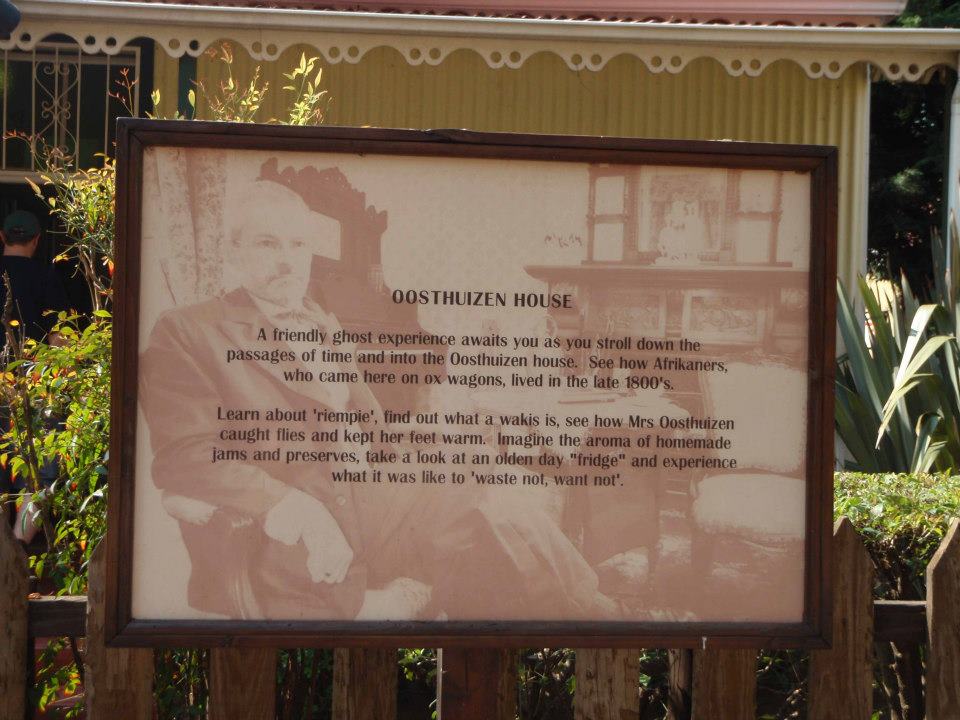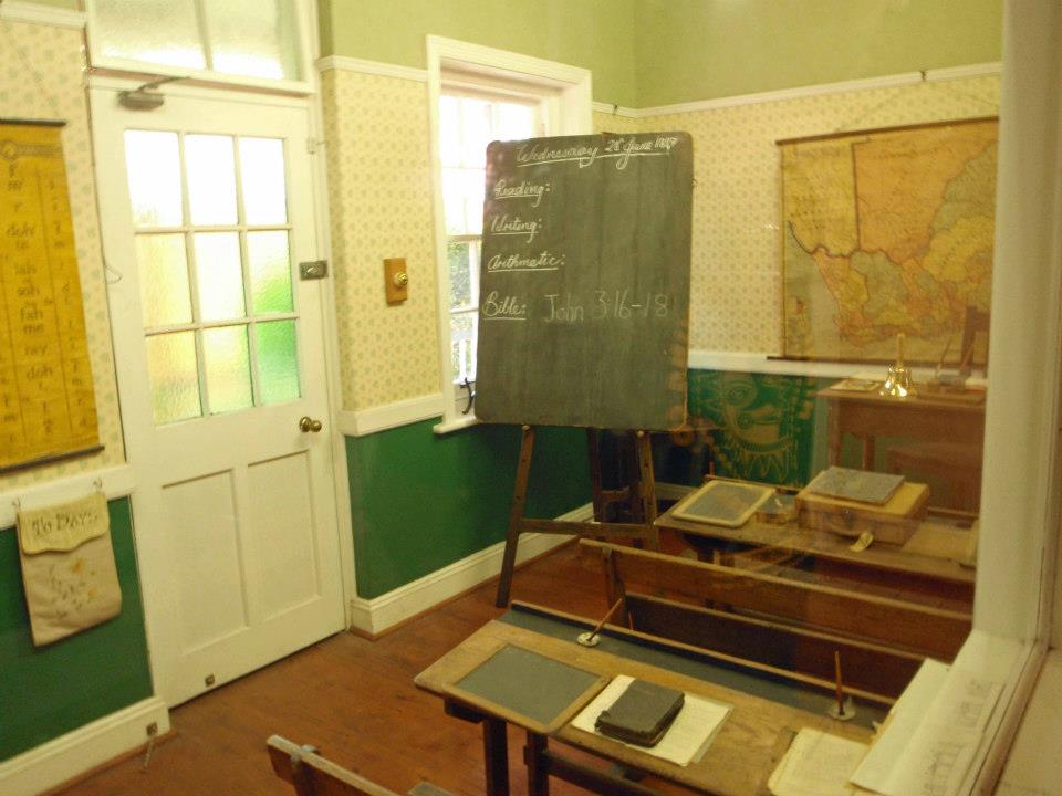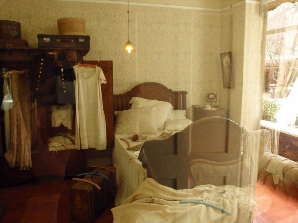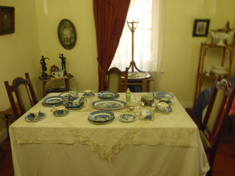 Another picture in the museum.A recreation of some of the mineworkers' quarters. Doesn't look very comfortable!My husband Jackie in front of one of the old houses that belonged to the mine managers / bosses.A sign in front of one of the historical houses.Another sign in front of another historical house.Inside one of the houses.Another view of the room. This bed looks much more comfortable than where the mineworkers slept!A dining room table. I really like Willow Ware plates such as the ones on the table.An old classroom.