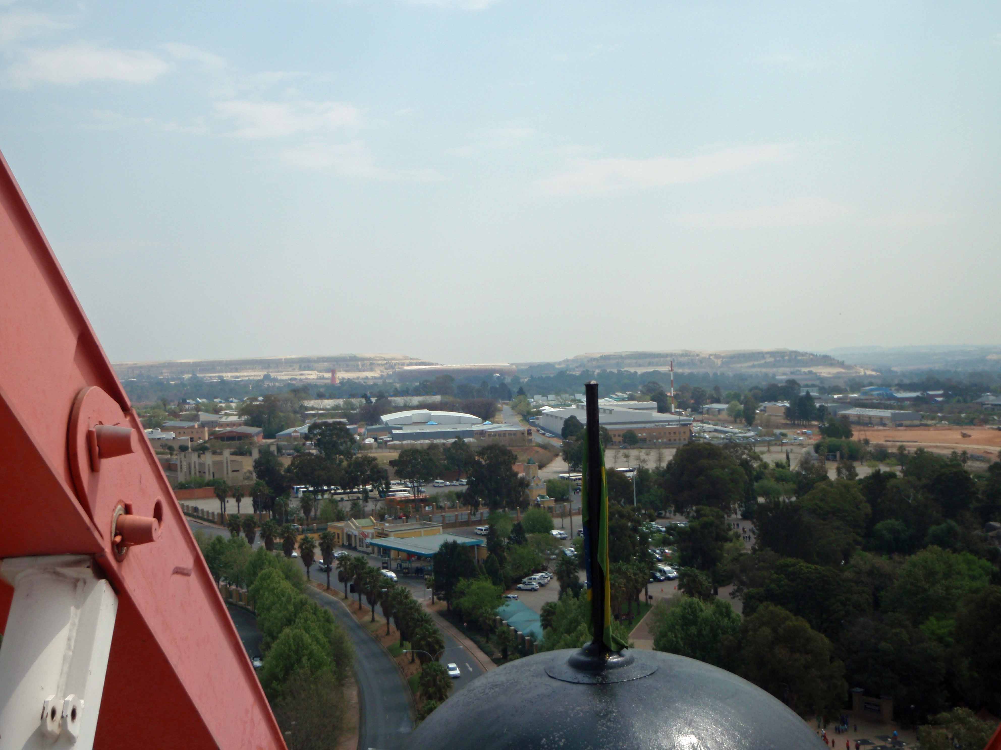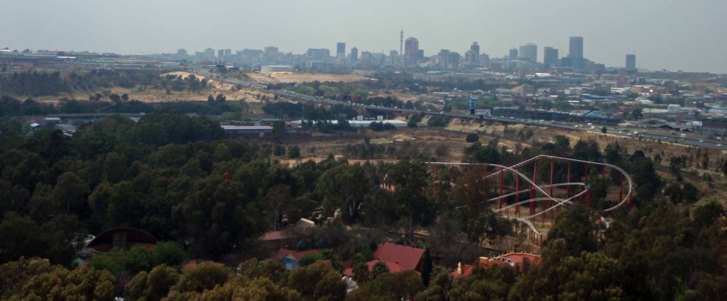 The scary ride that drops you suddenly. They have made this ride look like an old mine shaft.Thunder Mountain! Hang on... isn't that also at Disney?On the Thunder Mountain log ride at Gold Reef City.A steep part of the log ride.Another water ride. I like this one. You go down rapids in a giant spinning boat.One of the rollercoasters!A view of the Ferris Wheel.Some main tailings (in the distance) viewed from the top of the Ferris Wheel.More mine tailings (distance) viewed from the top of the Ferris Wheel.Downtown Johannesburg viewed from the top of the Ferris Wheel.