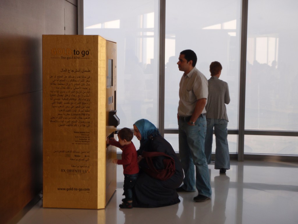 This week I’m continuing with sharing some pictures from my January 2012 trip to visit my friend Karima in Abu Dhabi, United Arab Emirates. One day we drove over to Dubai for some sightseeing. We drove around, did some shopping, and visited the Burj Khalifa, the world’s tallest building. When we were at the Burj Khalifa, I noticed a strange vending machine: one that sells gold! Specifically, the vending machine sells small souvenir gold bars with a picture of the Burj Khalifa on them. Those are some expensive souvenirs! I’m afraid I couldn’t afford one… although I did try out the golden dessert at the Emirates Palace Hotel in Abu Dhabi.