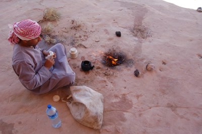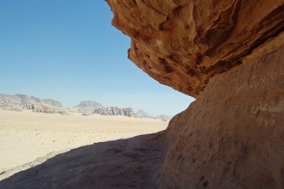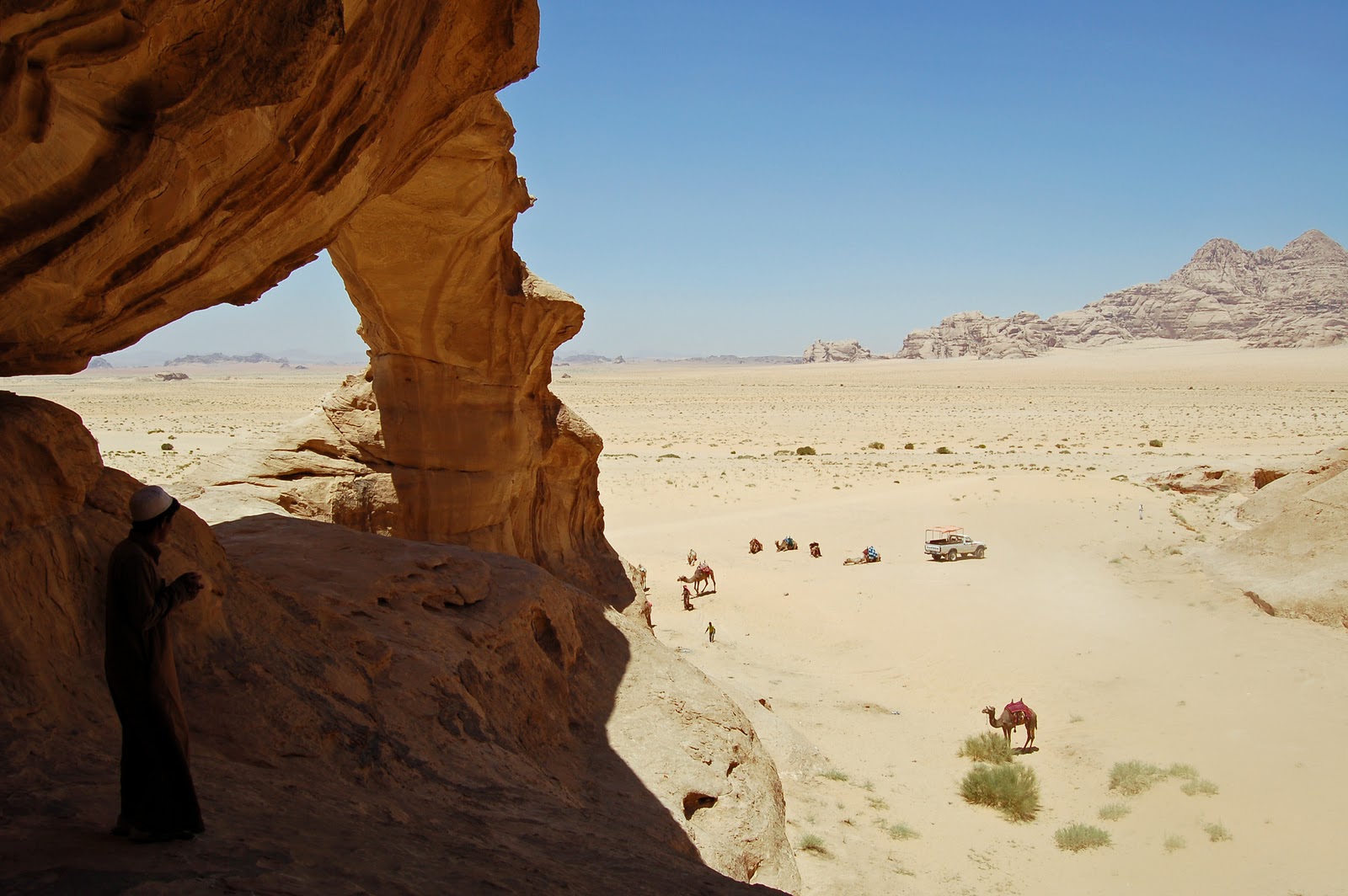 Lunch in the shade of a rock arch, Jordan, August 2007.