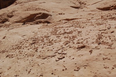 Geology picture-a-day week continues here at Georneys. Today’s geology picture comes from one of my favorite places on Earth: Petra, Jordan. Petra is an ancient Nabatean city nestled in a broad valley that is protected by steep sandstone terrain. Petra is accessed by the Siq, a narrow canyon through the sandstone. The geology of the Siq is impressive enough: the walls of the canyon reveal beautiful, red rose colored sandstone which contains cross-bedding, concretions, quartz veins, and other interesting textures. However, the Siq is made even more impressive by the archaeological artifacts it contains: ancient water aquaducts that run along the sides of the canyon (see the background of the above picture), windswept stairs leading to small niches carved out of the rock, and even remnants of what must have been large and impressive statues. In the picture above, you can see the remnants of a sandstone statue of a man leading a camel– but only feet and hooves remain. The small archaeological artifacts found in the Siq hint at the impressive wonders that are found within the city of Petra itself; the Siq teases visitors and leads them along in anticipation.