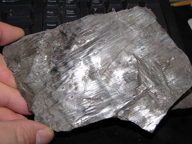 When using luster to identify a mineral, it is important to know that many minerals can have more than one type of luster, in the same way that many minerals come in different colors. Thus, luster should be used cautiously for mineral identification. A good example is shown in the photograph at the top of this post. This photograph shows a shiny rock with a metallic luster. At first glance, you might think that the rock contains mica, which can have a similar metallic luster and a similar color. However, the rock is actually an iron-rich rock that mostly consists of hematite. The portion of the rock with the metallic luster is specularite, also known as specular hematite. Note that a portion of the rock has a reddish brown color. This part of the rock has a dull or earthy luster and is also hematite. To properly identify the minerals in this rock, a geologist must use other properties in addition to luster. For example, the density of the rock (iron is heavy) and the streak of the rock. Specular hematite will leave a reddish brown streak while mica will leave a whiteish streak.