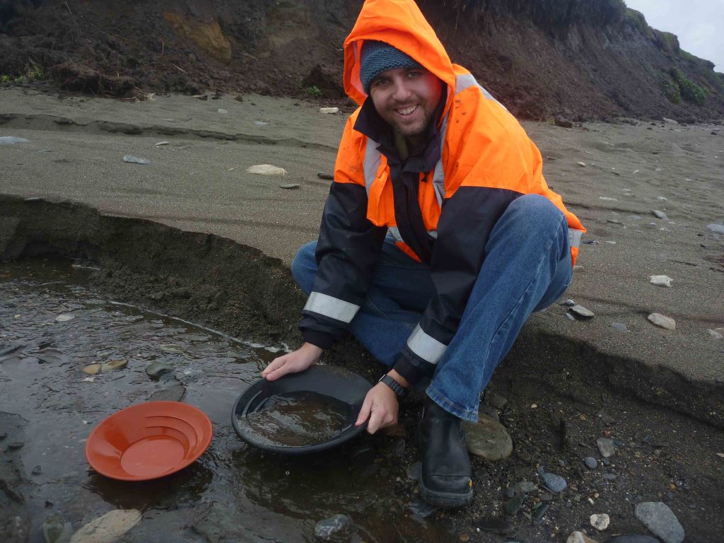 My husband Jackie panning for gold on the beach in Nome, Alaska, Summer 2012.Me, posing with a bag of heavy mineral concentrate (and gold!) on the Nome beach. That's an old gold mining dredge in the background. Nome, Alaska, Summer 2012.A gold pan with garnet-rich sand and little flakes of gold. Nome, Alaska, Summer 2012.