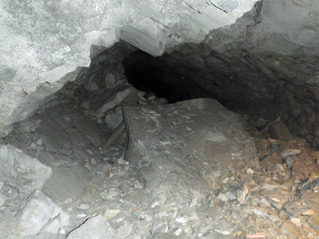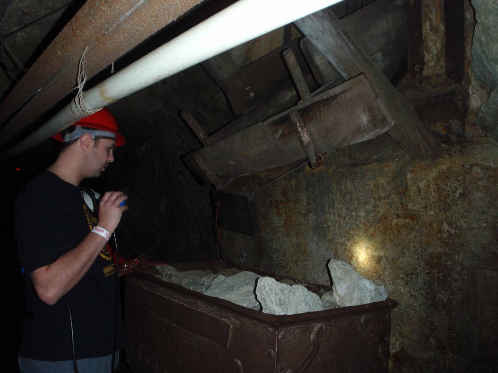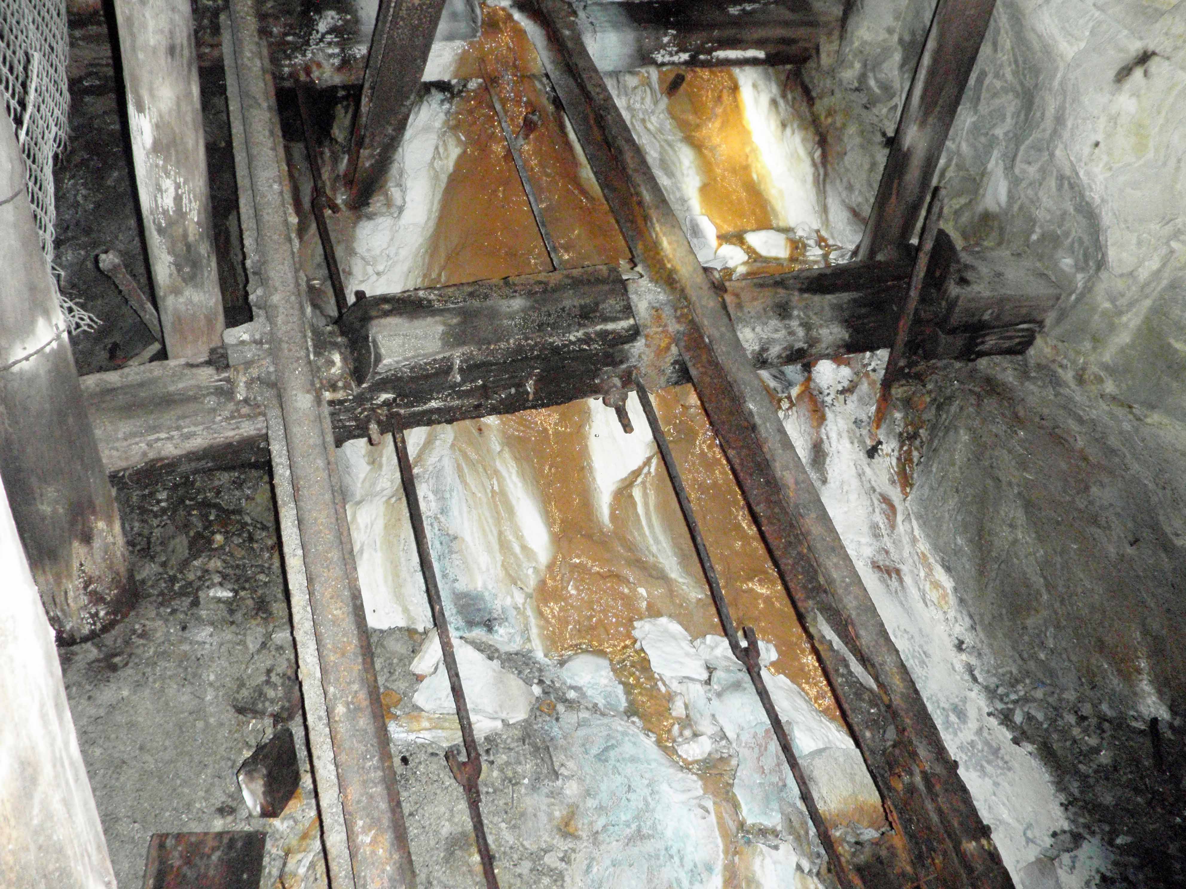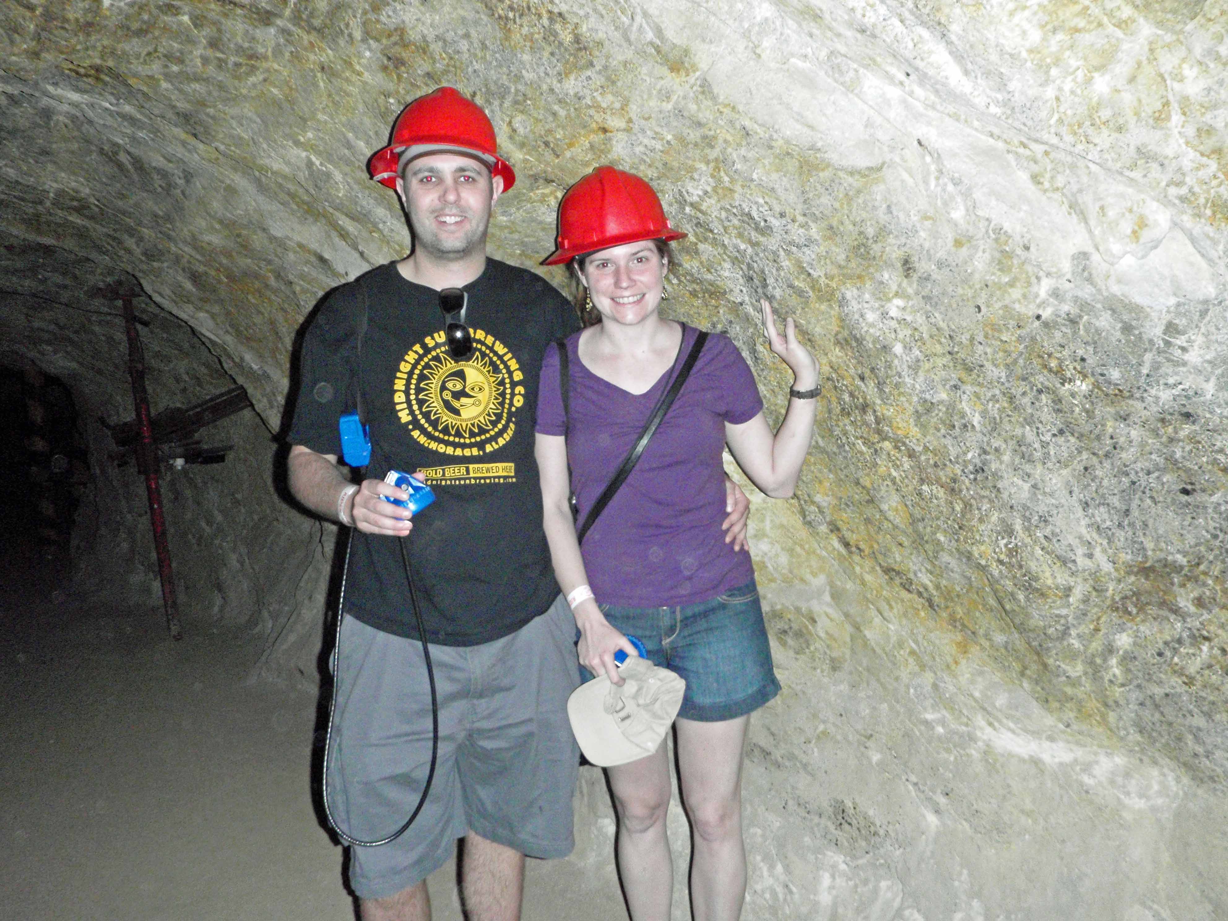 Mining supports and a chute.Jackie checking out one of the old chutes.A simple device for counting.A collapsed part of the mining shaft.A rock drill.Rocks!Mining shaft with creepy mannequin man.Mine shaft supports.Closer view of the mine shaft surfaceInformational sign about the mine. We went to the red depth-- the mine used to go quite a bit deeper!Another view of the rockfaceOld informational sign.Another chute. That's travertine (carbonate rock) forming on the bottom.Another old informational mine sign. I have not idea what a "Tchisa Stick" is. Does anyone know?More signs.Even more signs.Headed back to the elevator.
