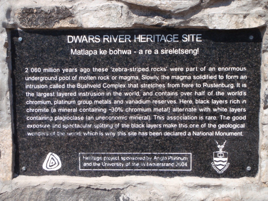 Chromitite seams in the Bushveld Igneous Complex, exposed at Dwars Rivier. Picture taken by Jackie Gauntlett.Informational sign for the Dwars River Heritage Site in the Bushveld Igneous Complex. Picture taken by Jackie Gauntlett.