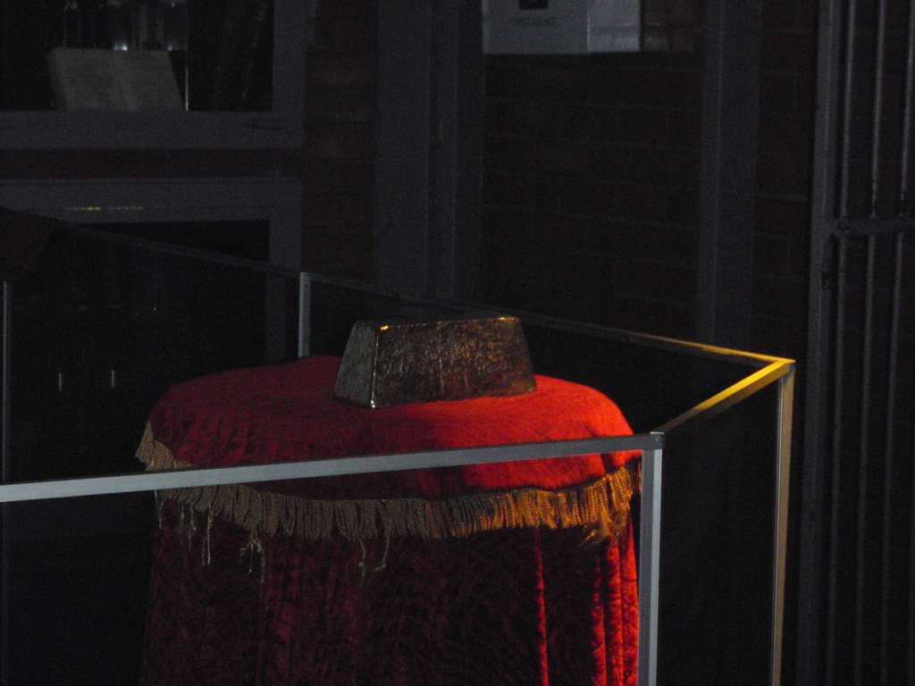The gold price in September 2012. This sign is updated daily, I believe. The gold price has dropped significantly since last September.Another reminder.Demonstration #1.Demonstration #2.Demonstration #3.Demonstration #4.Hot hot hot!Hot and glowing.A real gold brick. I think. Possibly this is a fake brick.