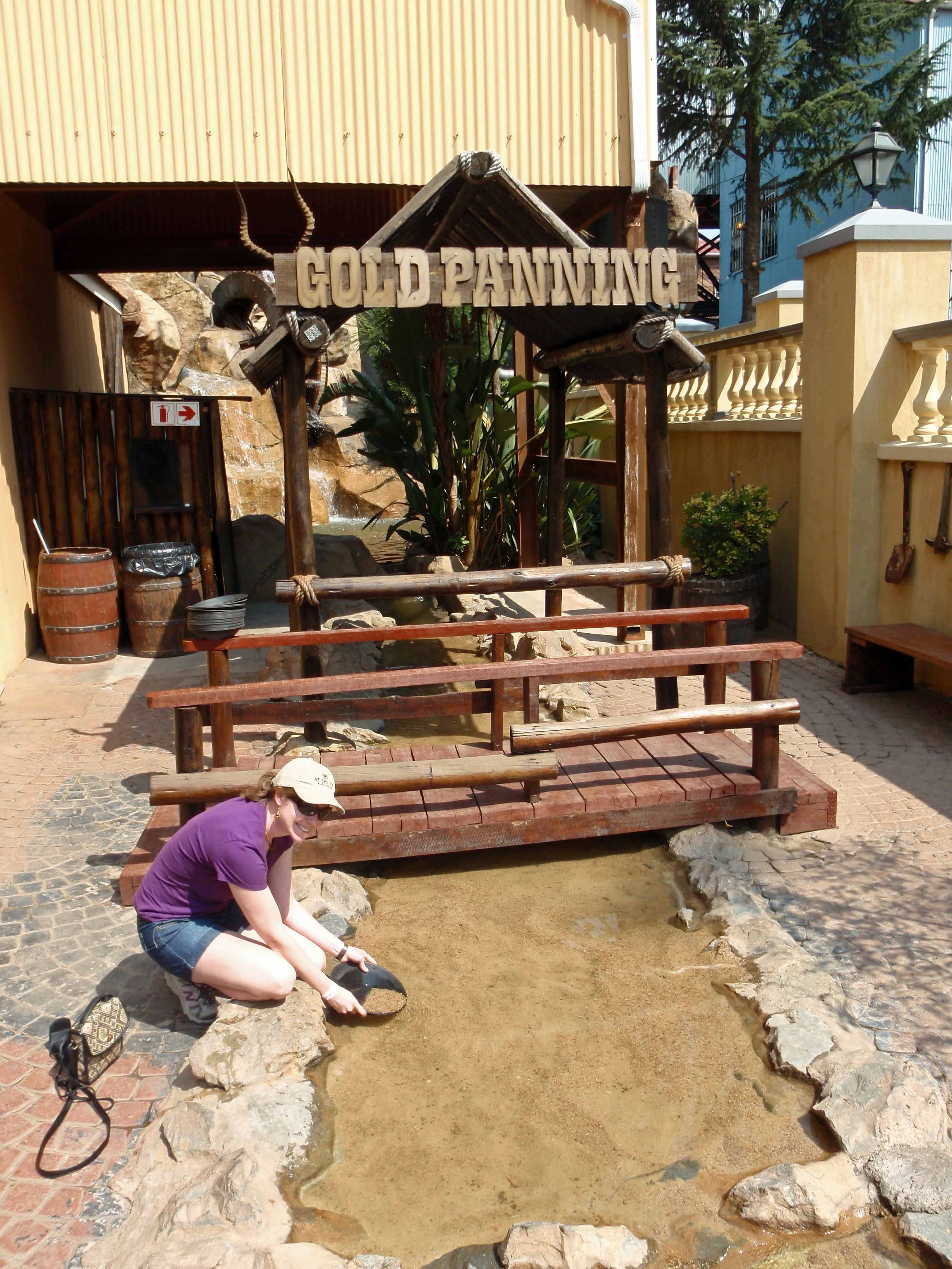 After passing through the mining-themed entrance, going on an underground mine tour, and watching a gold pouring demonstration at Gold Reef City (a gold mining themed amusement park in Johannesburg, South Africa), my husband and I decided to try the “Gold Panning” activity. I must admit, we were somewhat disappointed in this activity, which involved “panning” for some shiny metal (but not gold– it was very different in texture, density, etc.) in a fake stream filled with some quartz sand. My husband and I both work for a gold exploration company, so we have experience panning for real gold in the field. We found the Gold Reef City “Gold Panning” experience to be less-than-satisfying. But we took a picture of me “panning” anyway.