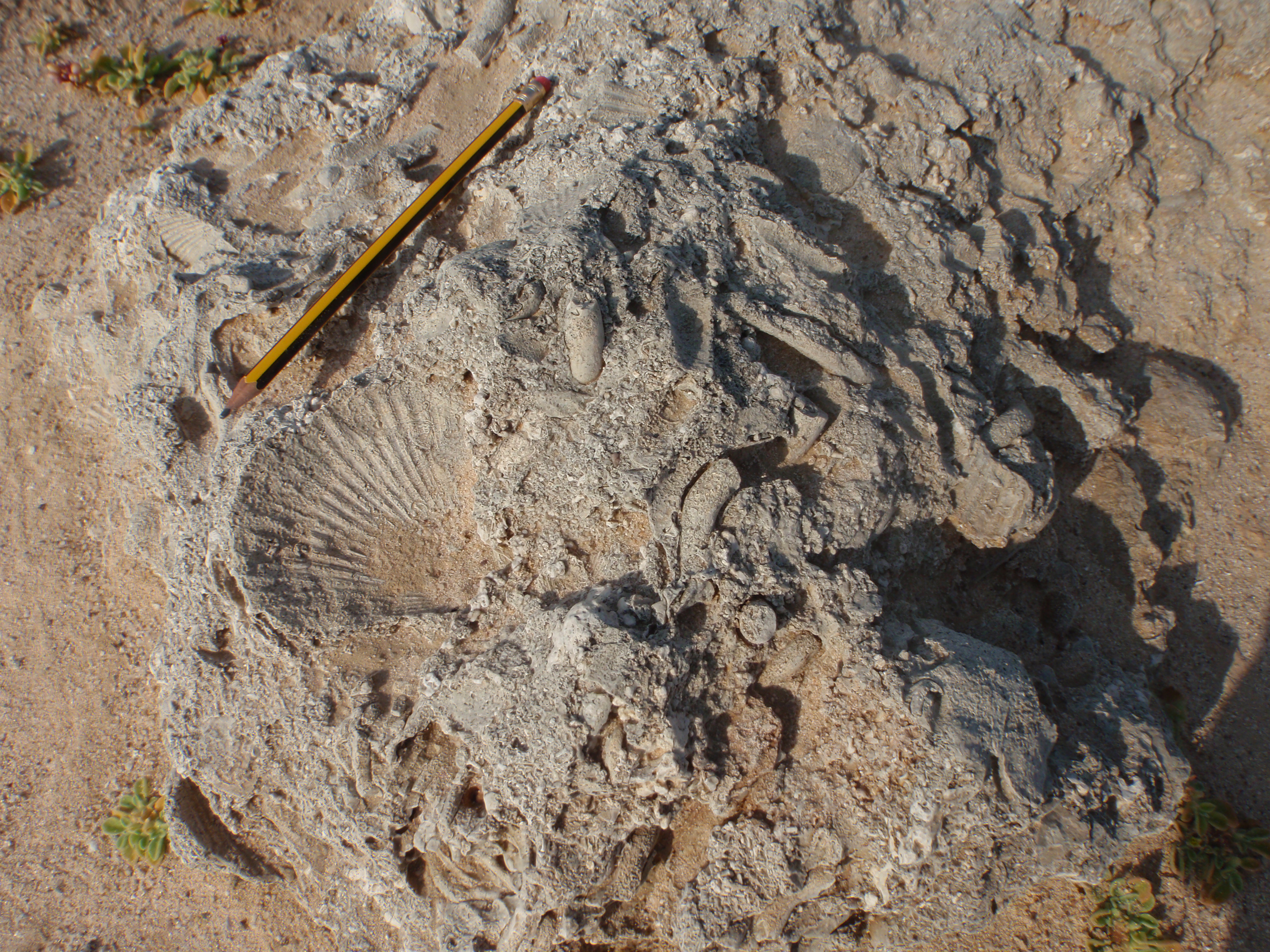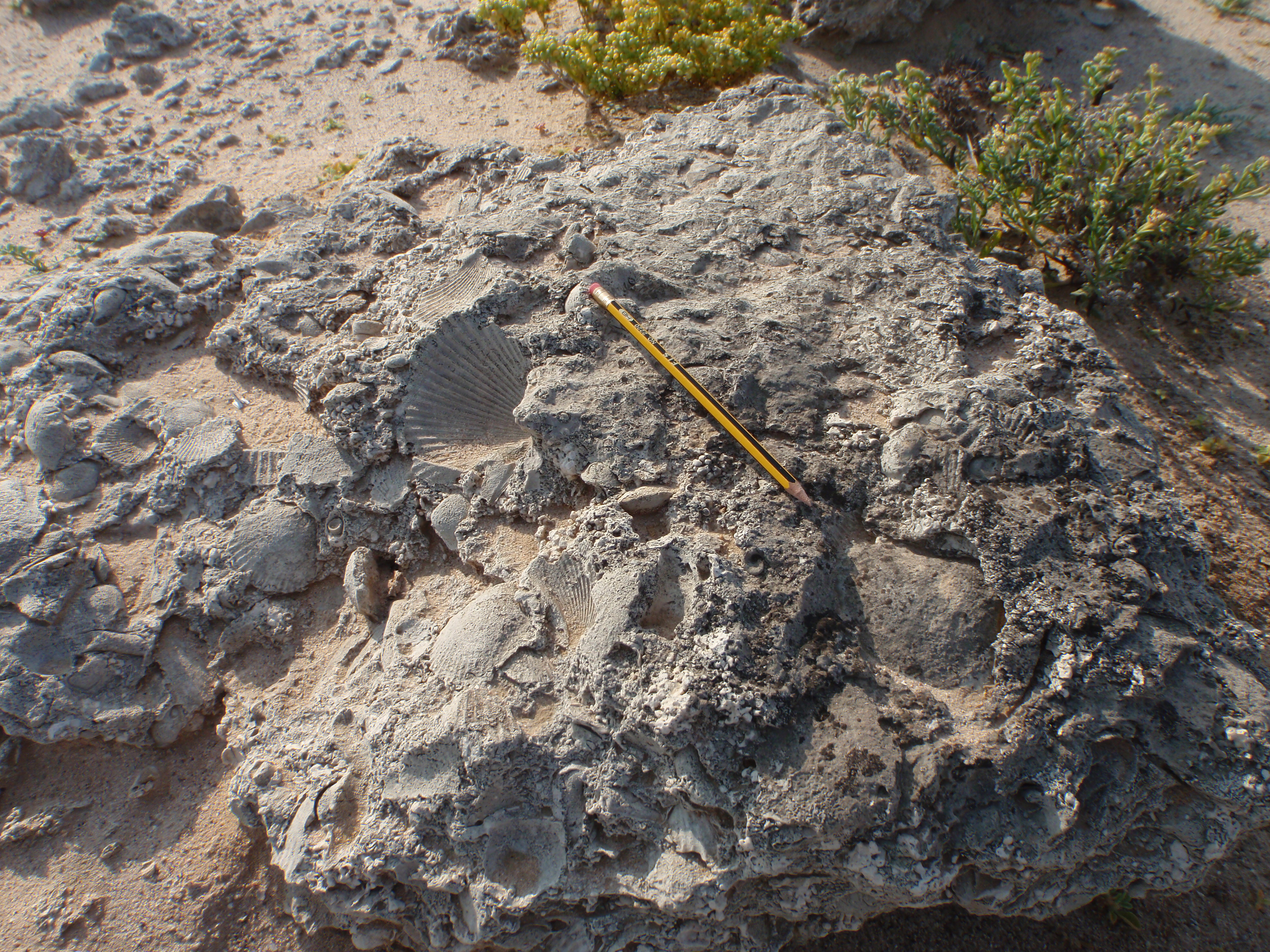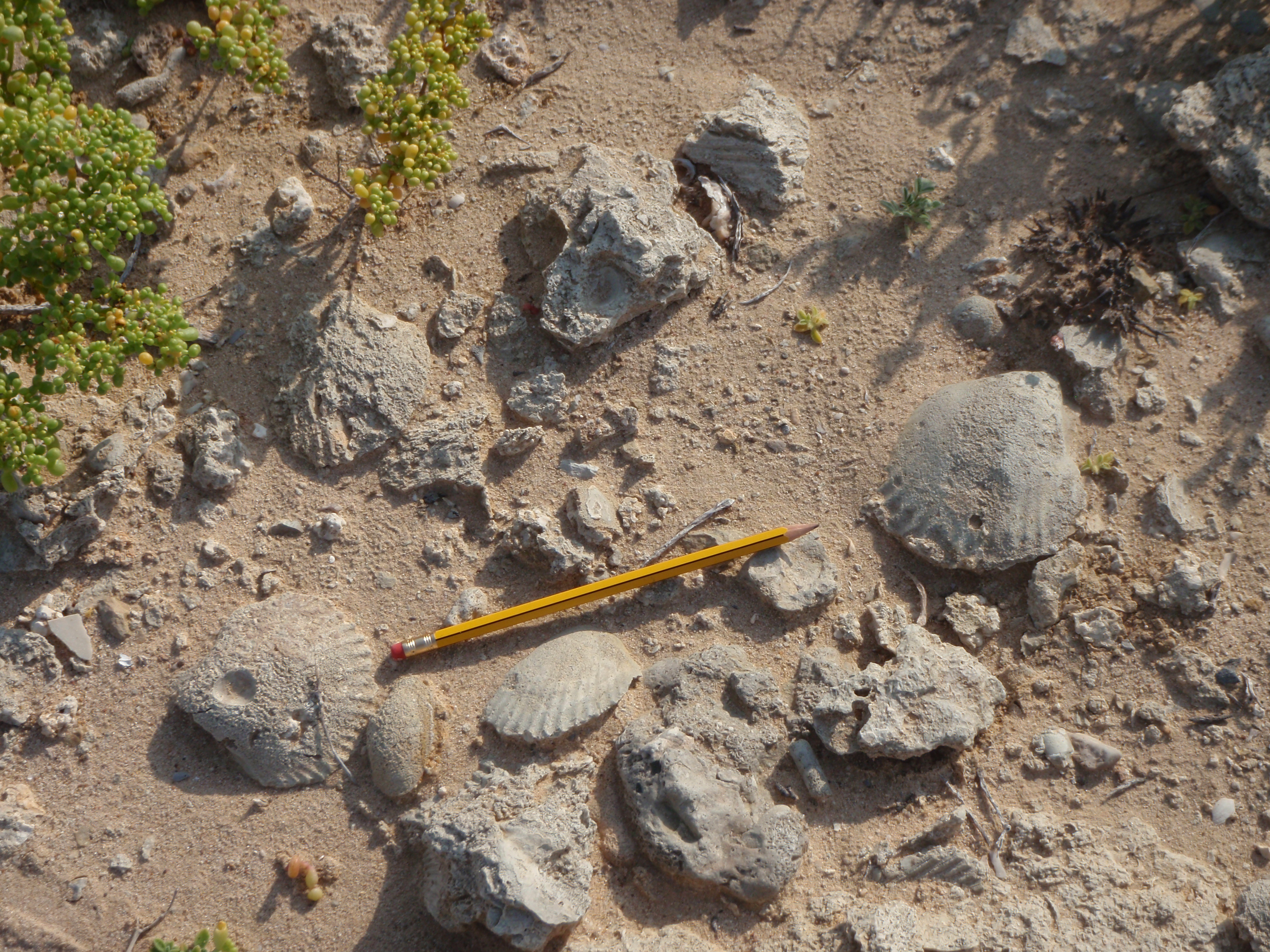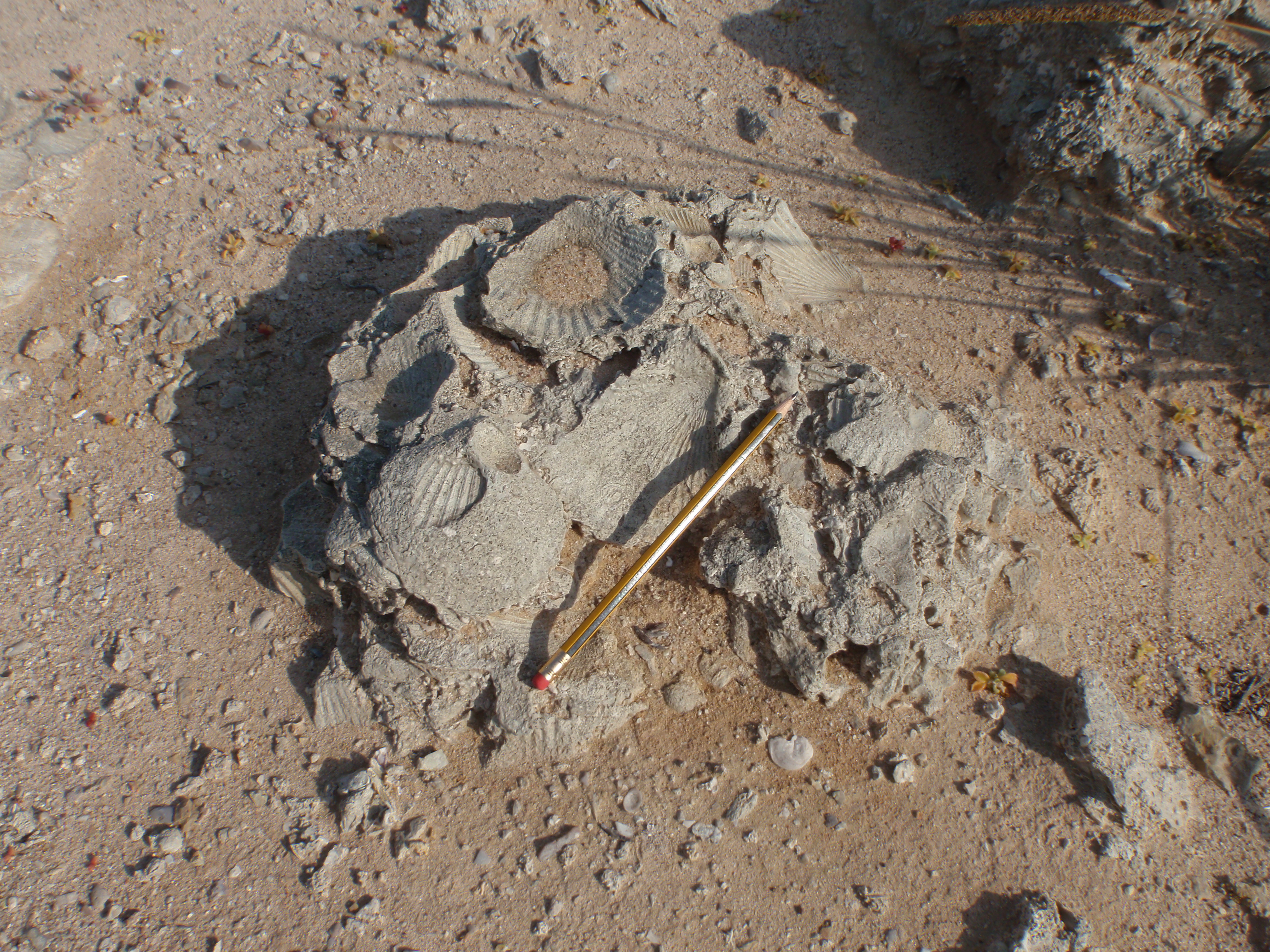Below are a few more pictures of the seashell fossils. Note that the fossils form as both molds and casts. Also note the pencil for scale.