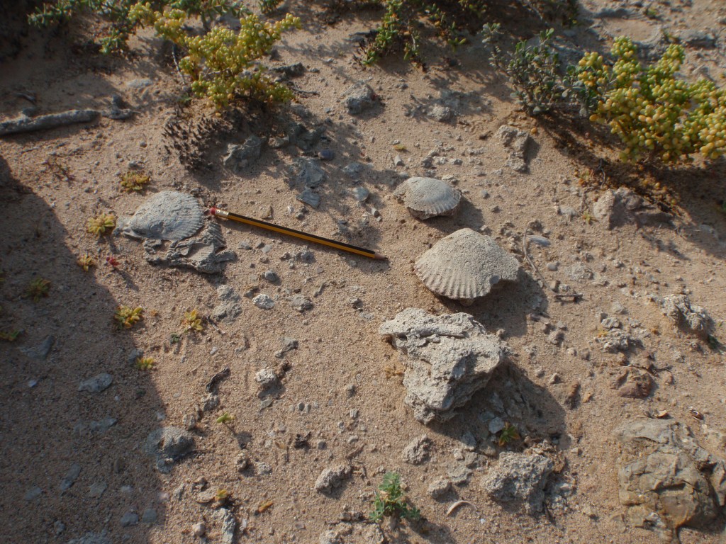 For this week’s Monday Geology Picture post, I thought I would share some more pictures from my trip in January to Barr Al-Hikman, Oman. A few weeks ago, I posted about some crabs and their traces at Barr Al-Hikman. This week I am sharing some pictures of some large, beautiful, fossilized seashells which we observed along one of the beaches at Barr Al-Hikman. I believe that these seashell fossils formed fairly recently. I think that the seashell species (or perhaps a close relative) still exists today in Omani waters. Also, some of the fossilized shells contain un-fossilized shell fragments.
