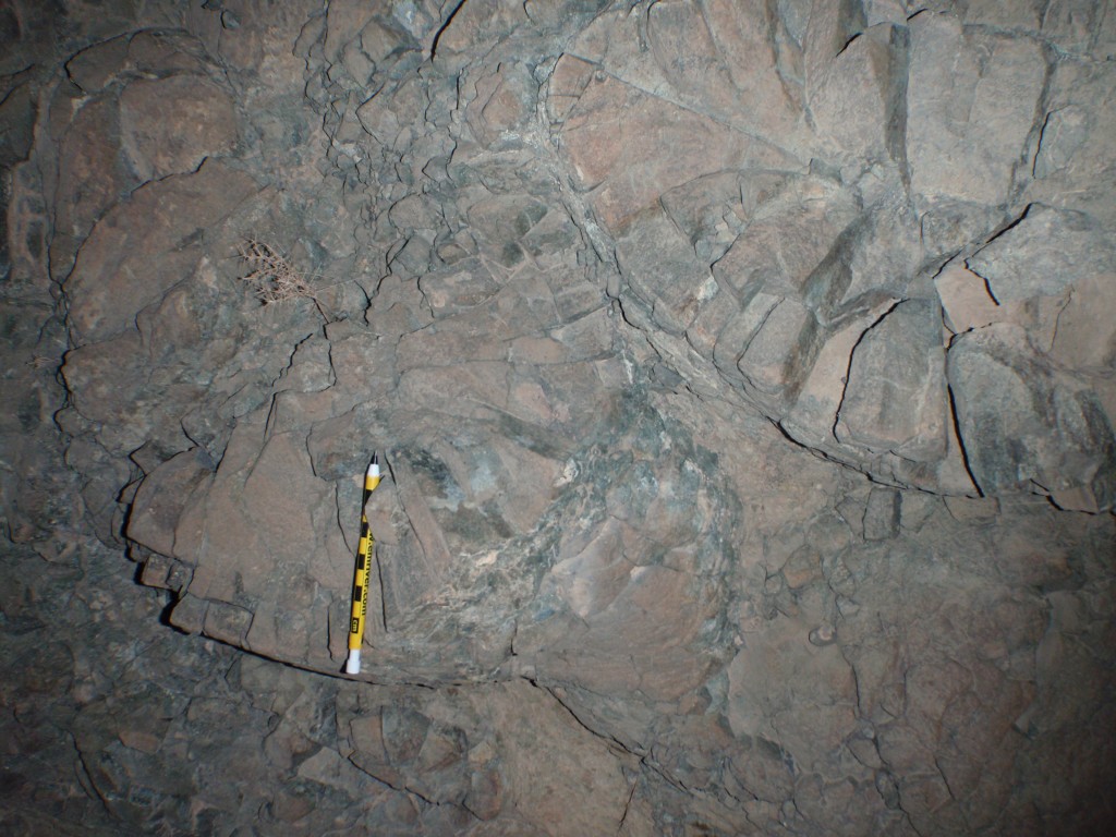 Finally, below are few more pictures of some Omani pseudospeleothems. These pseduospeleothems are forming in overhangs in travertines (carbonate precipitates) which are forming at the surface of the peridotite layer of the ophiolite. Be sure to click on the two panoramas to enlarge them. Note the location of the pseudospeleothem column in the two panoramas. Many pseudospeleothems are located in the overhang around this column. The last picture has my colleague Lisa standing next to this column for scale; this shows the enormous size of the travertine deposit.