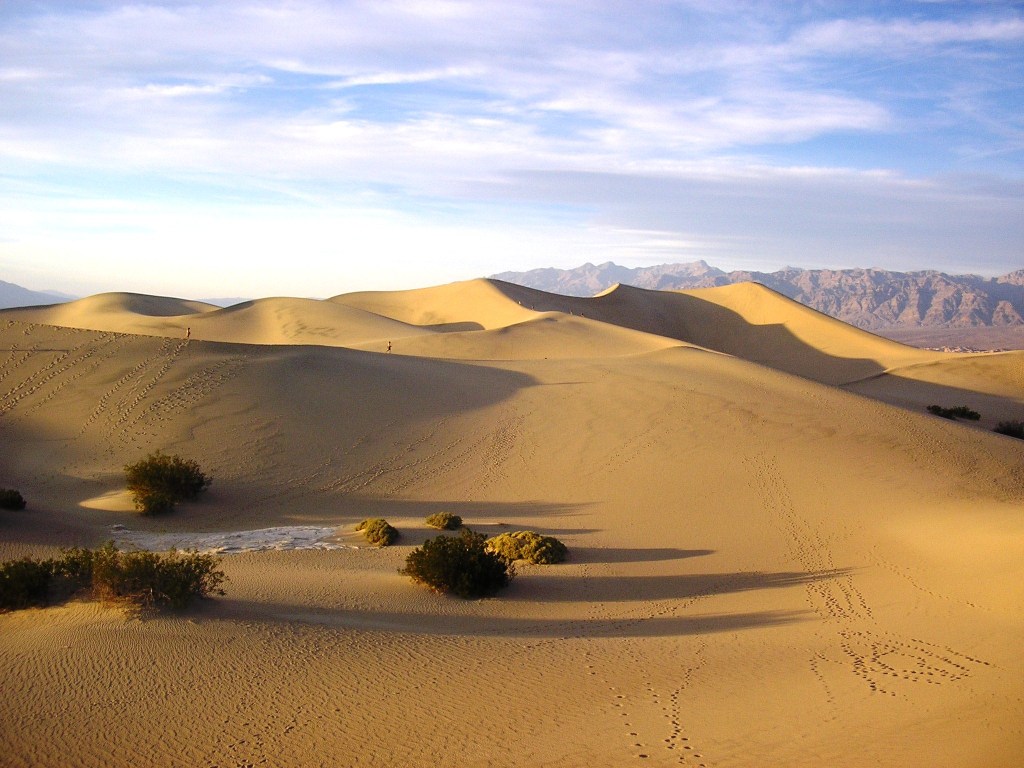 Here is my contribution to the meme– some pictures of sand dunes in Death Valley, California. I visited these sand dunes near sunset after a long day of mapping with my undergraduate fieldwork program in Fall 2005. Our instructors had promised we could visit the dunes once we finished working, but by the time we finished we only had an hour or two of light left. So, we had to race out to the dunes, first by driving and then by walking or running as quickly as we could on the soft sand. We spent a few minutes tumbling and rolling down the dunes then made our way back to the vans as darkness fell.