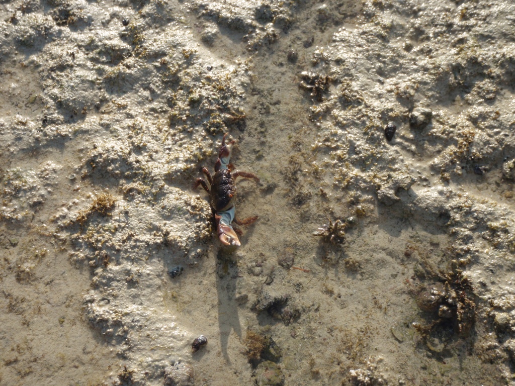 The first species is a dark red colored crab that I observed when walking out on some of the modern coral and carbonate deposits. These crabs were scuttling about everywhere, but if you came too close to them they would  dart into small cracks and crevices in the carbonates and put up their big claw defensively.