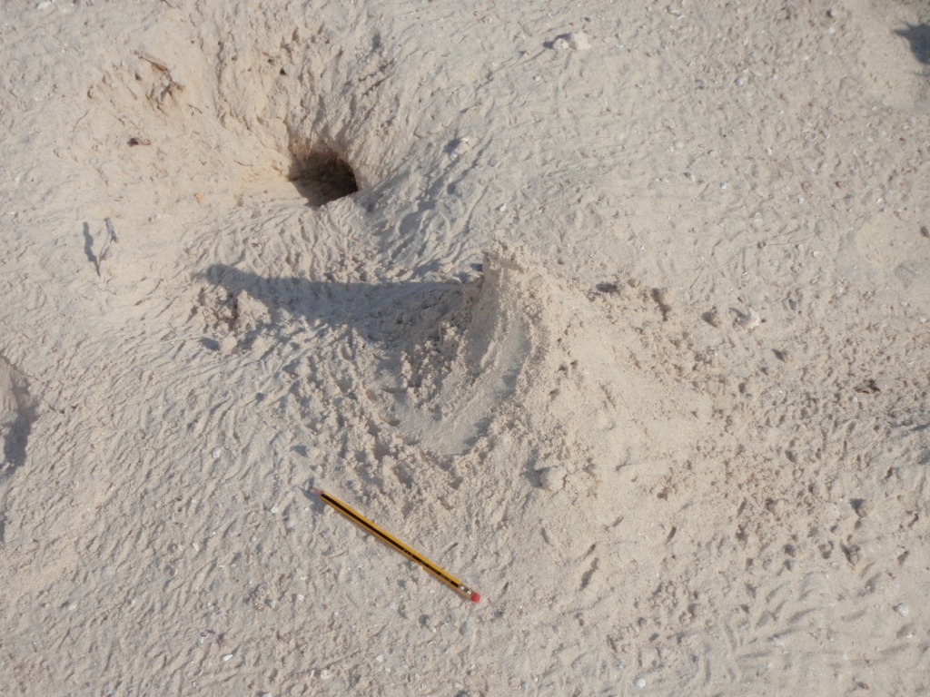 The second species of crab which I observed is a very tiny, tan-colored crab. We actually pulled this poor little guy out of his home. On several of the beaches, we noticed small holes surrounded by small balls of sand. The field trip leaders informed us that these the little balls of sand are called “sand bubbles” and that they are produced by the tiny crabs that live in the little holes. The sand bubbles are made by the crabs when they emerge from their holes during low tide to search for bits of food that have been brought in by the recent high tide. After they search through a few grains of sand, the crabs roll the sand grains into a tiny ball so that they don’t search the same sand grains again. Smart behavior, if you ask me! Sand bubbles can leave some spectacular patterns and designs on the beaches, as show in this article.