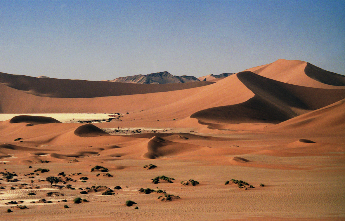 | Nabkhas in front of sand dunes in Namibia. Photo courtesy of Michael Welland and used with permission. |