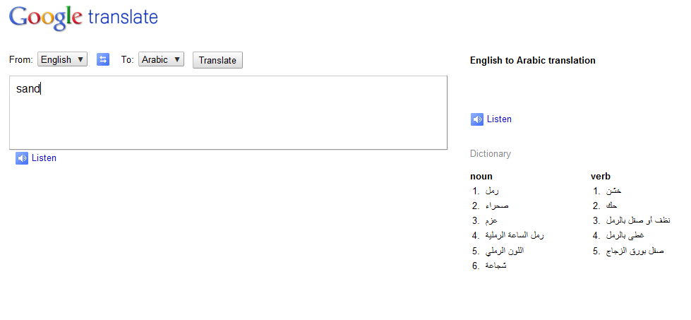 | English-to-Arabic translation of “sand” on Google Translate. Click to view larger. |