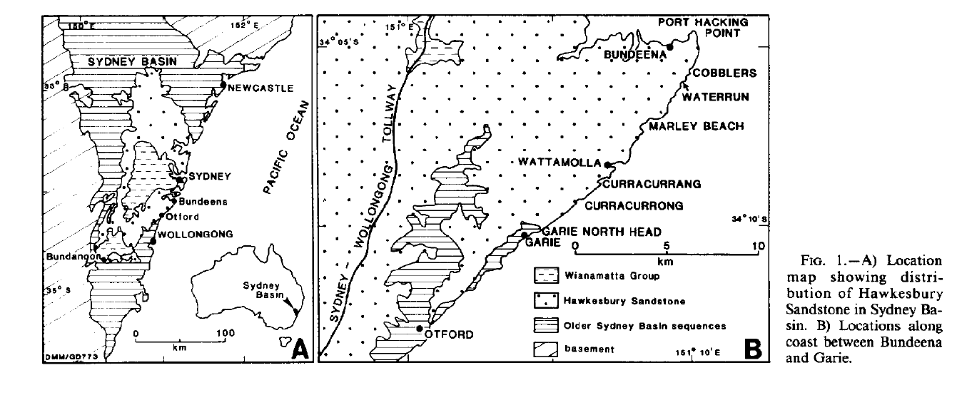 Map showing the extent of the Hawkesbury Sandstone in the Sydney Area. Map from Rust and Jones (1987), Journal of Sedimentary Research, Vol. 57, No. 2: 222-333. Click to enlarge.