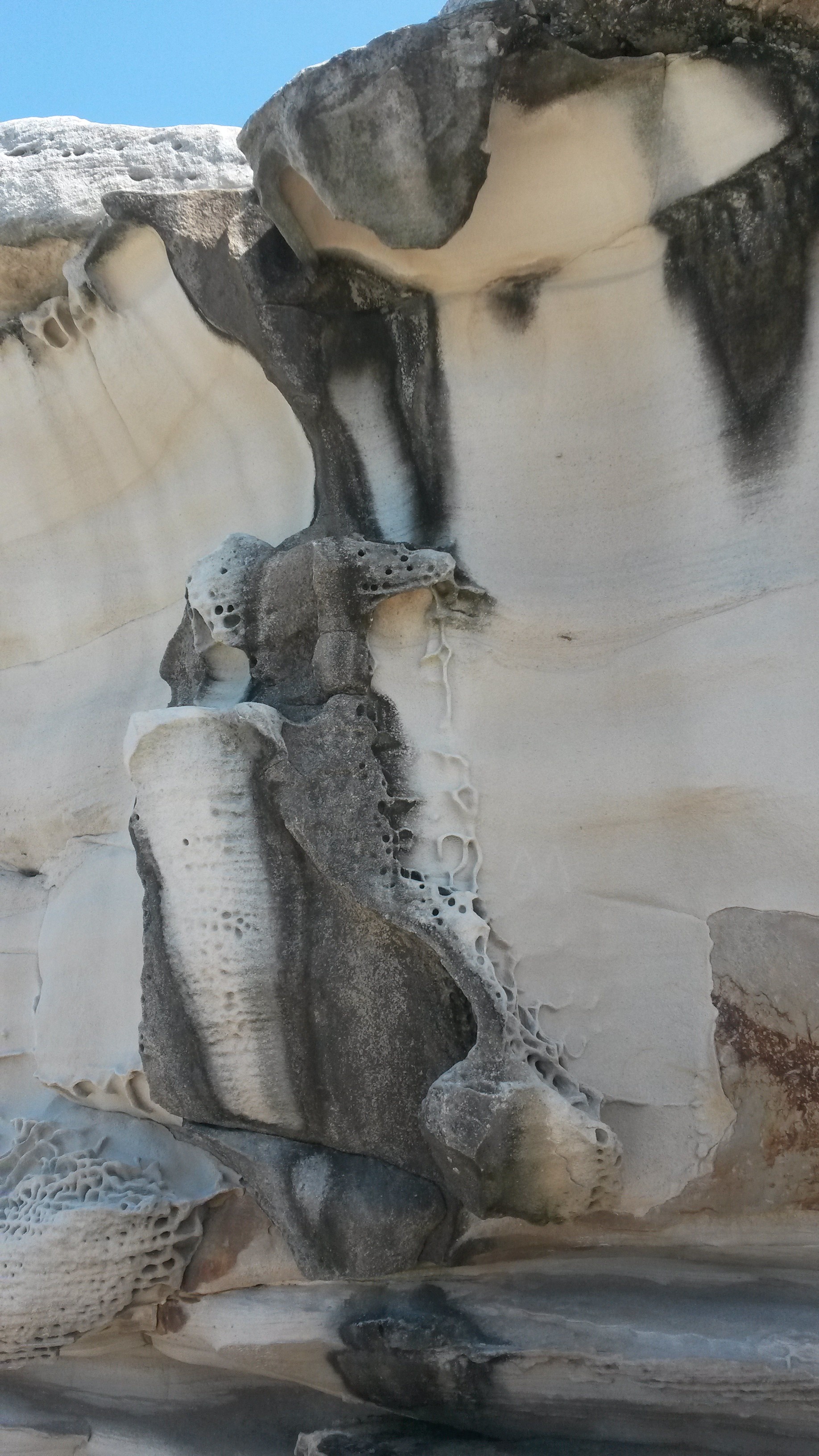 Here’s another picture from my recent trip to Australia. This picture shows a weathered sandstone outcrop that I saw (by kayak!) at a place called Cottage Point. You can see fresh banded sandstone (light in color) underneath a darker weathering rim. Weathering has created some very interesting shapes in this outcrop!
