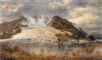 Pink terraces, near Rotorua, New Zealand. Painting of the terraces done prior to 1886. Image taken from here.