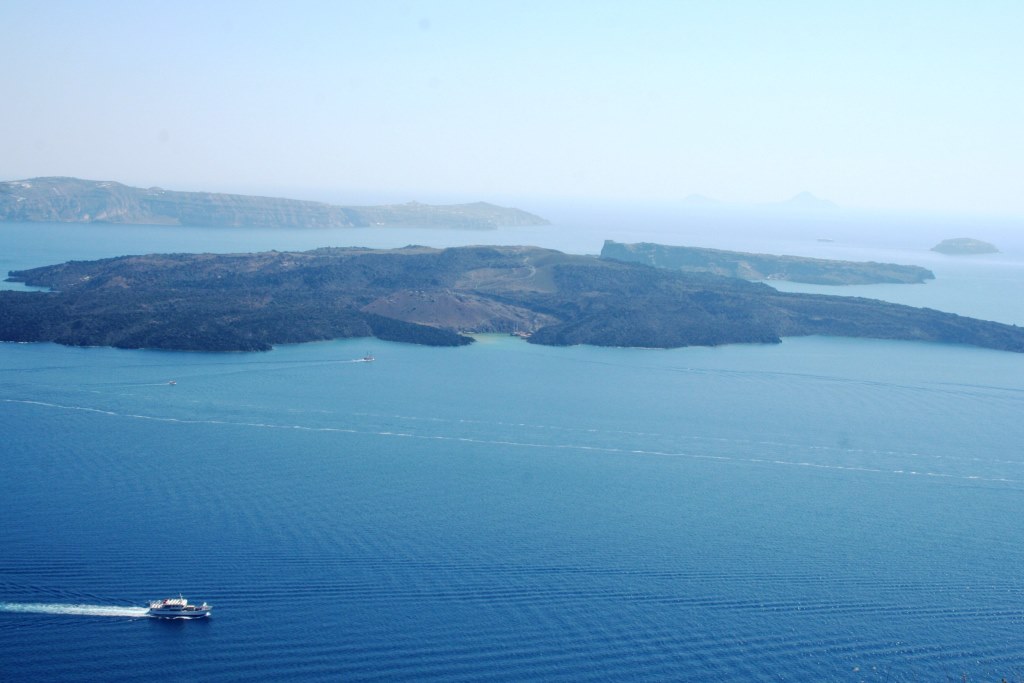Beautiful Santorini. The boats are travelling across an enormous, water-filled volcanic caldera.